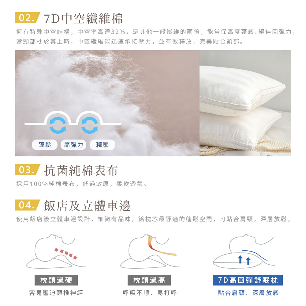 7D高回彈舒眠枕:40度溫和洗滌/可乾洗/低溫烘乾/不可漂白/不可熨燙