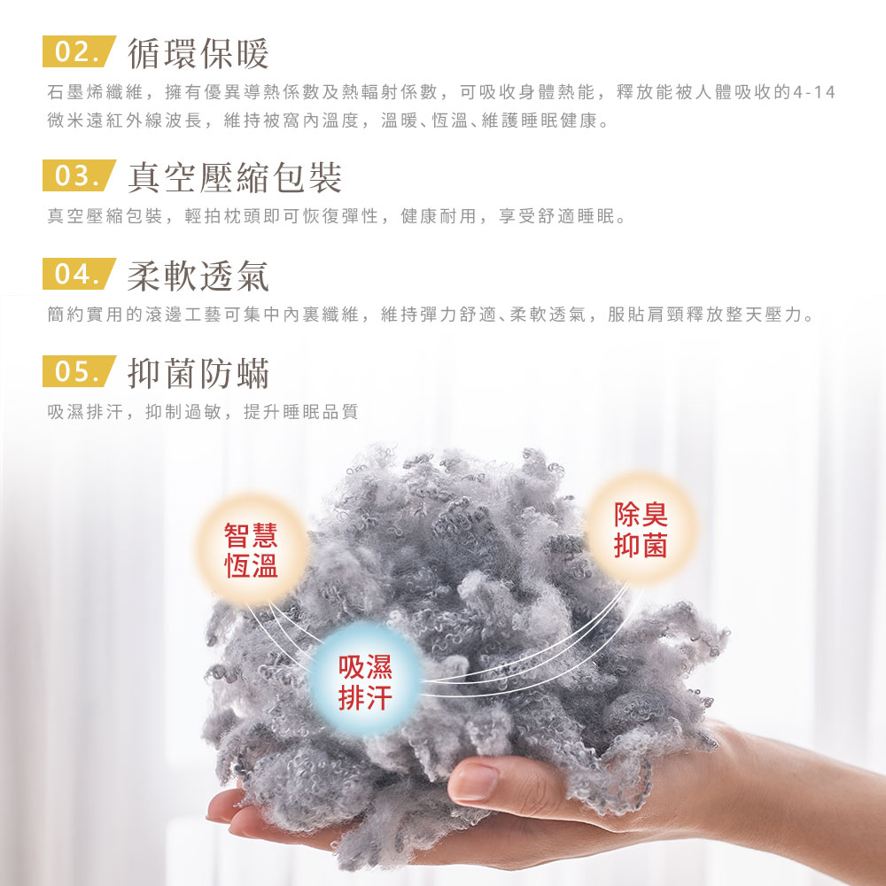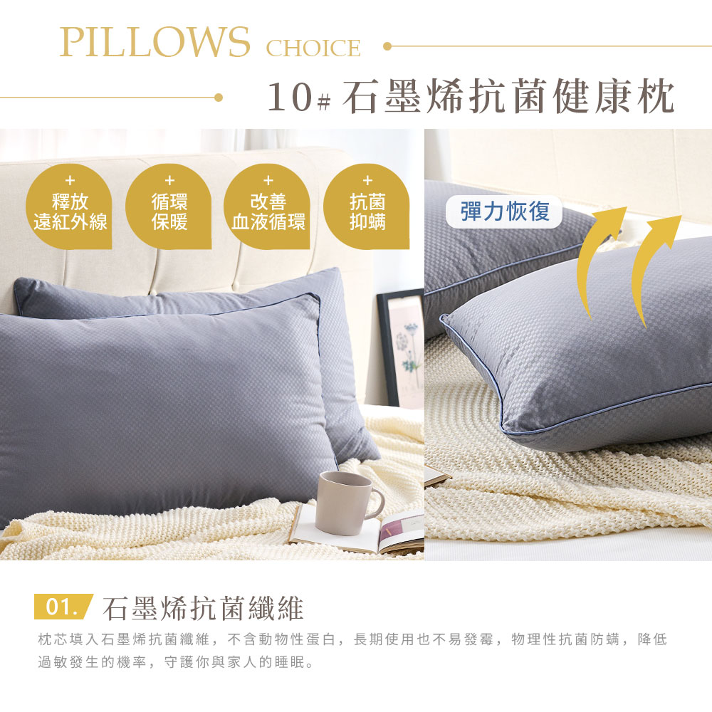 石墨烯抗菌健康枕:可水洗/可乾洗/不可漂白/不可烘乾/不可熨燙