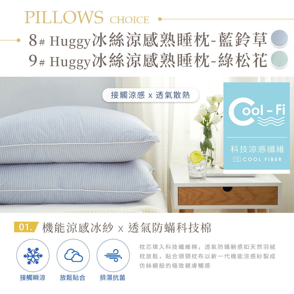 Huggy冰絲涼感熟睡枕:溫和洗滌/可乾洗/不可烘乾/不可漂白/不可熨燙