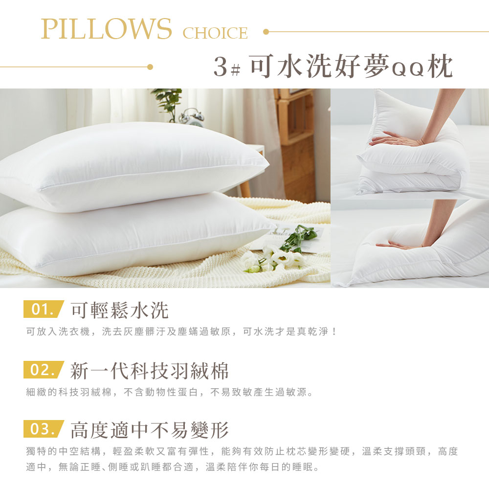 可水洗好夢QQ枕:40度以下溫和洗滌/可乾洗/低溫烘乾/不可漂白/不可熨燙