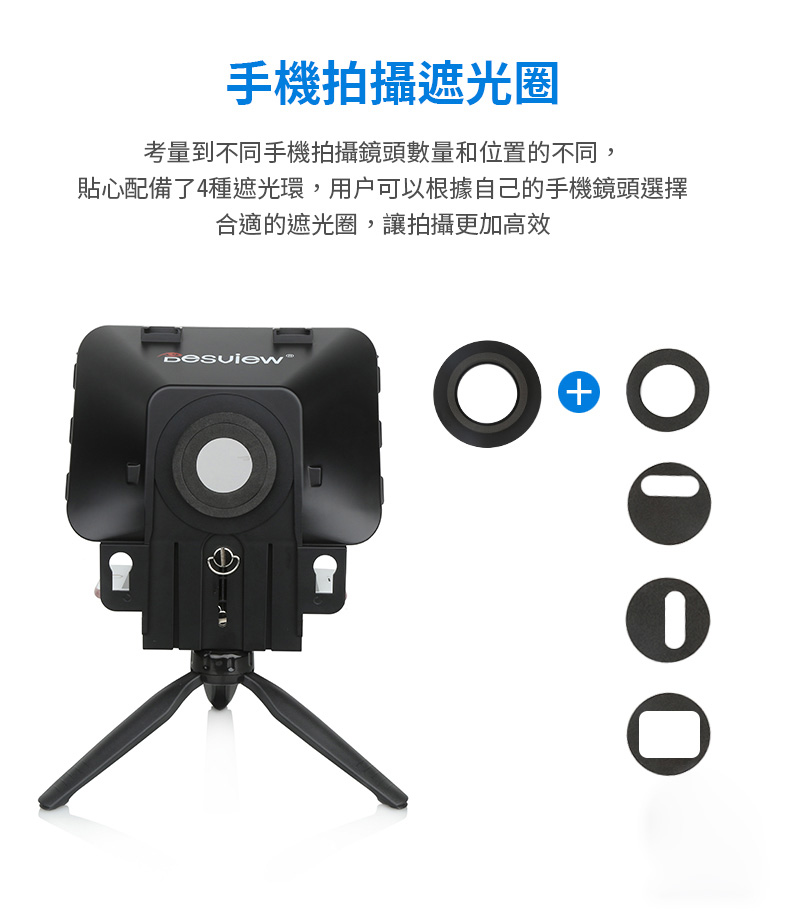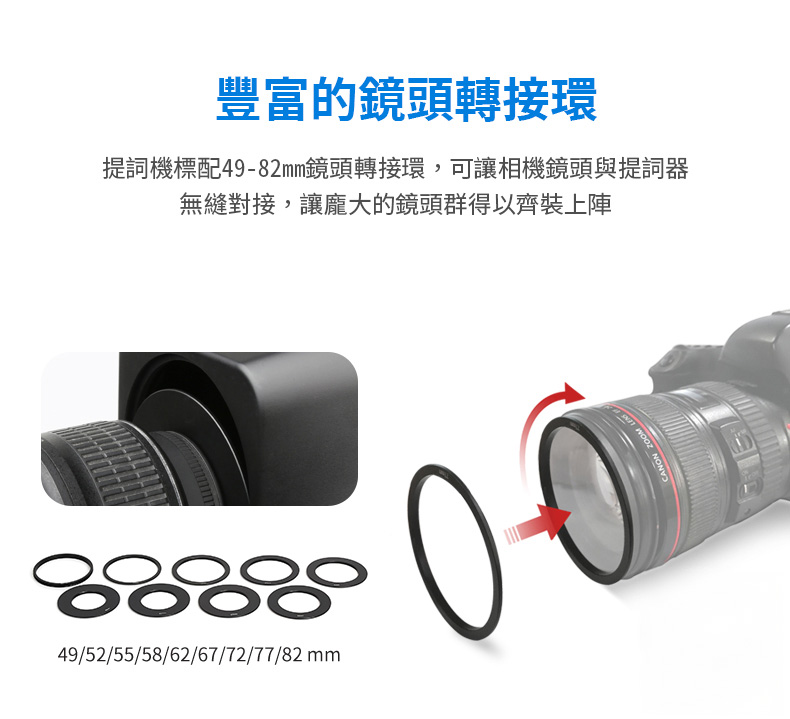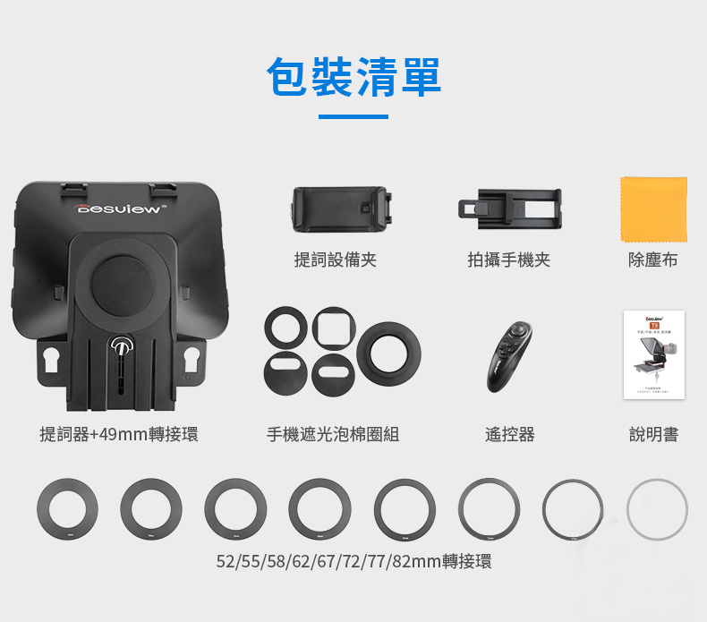 標配清單 除塵布 X1 說明書 X1 提詞設備夾 X1 拍攝手機夾 X1 藍芽遙控器 X1 提詞器 & 49mm轉接環 X1 手機遮光泡棉圈組 X1 52/55/58/62/72/77/82mm轉接環 各X1
