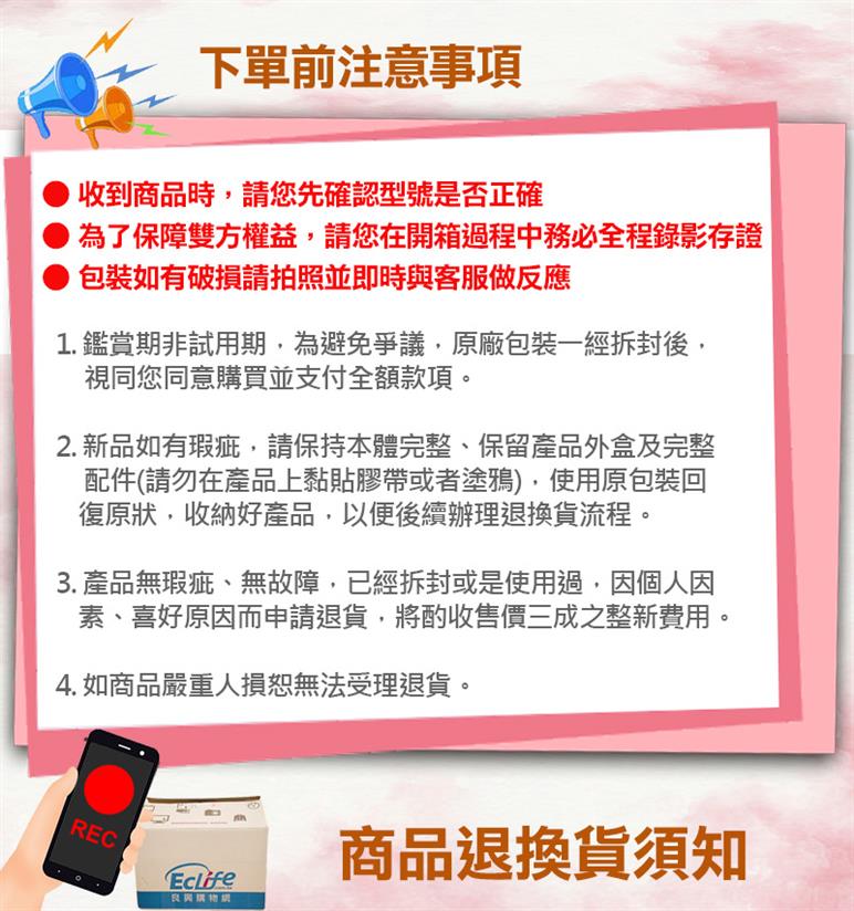 本店是否提供消費者保護法七日猶豫期之權利 遽消費者保護法及通訊交易解除權合理例外情 事適用準則,依商品性質各有不同規定。詳細 退換貨說明請參照各商品頁面說明。
