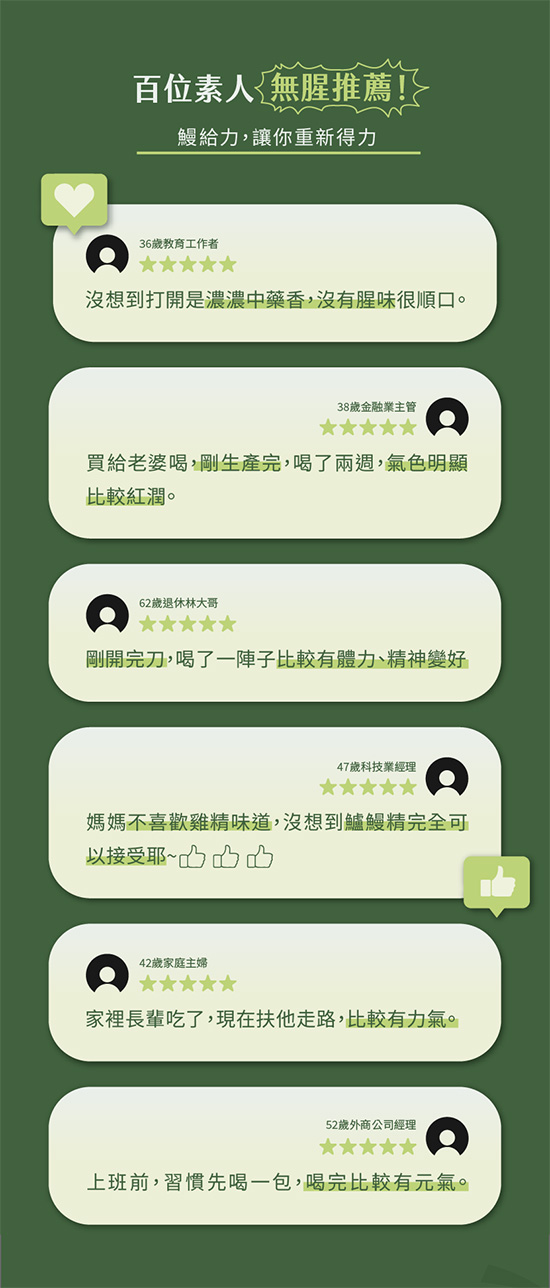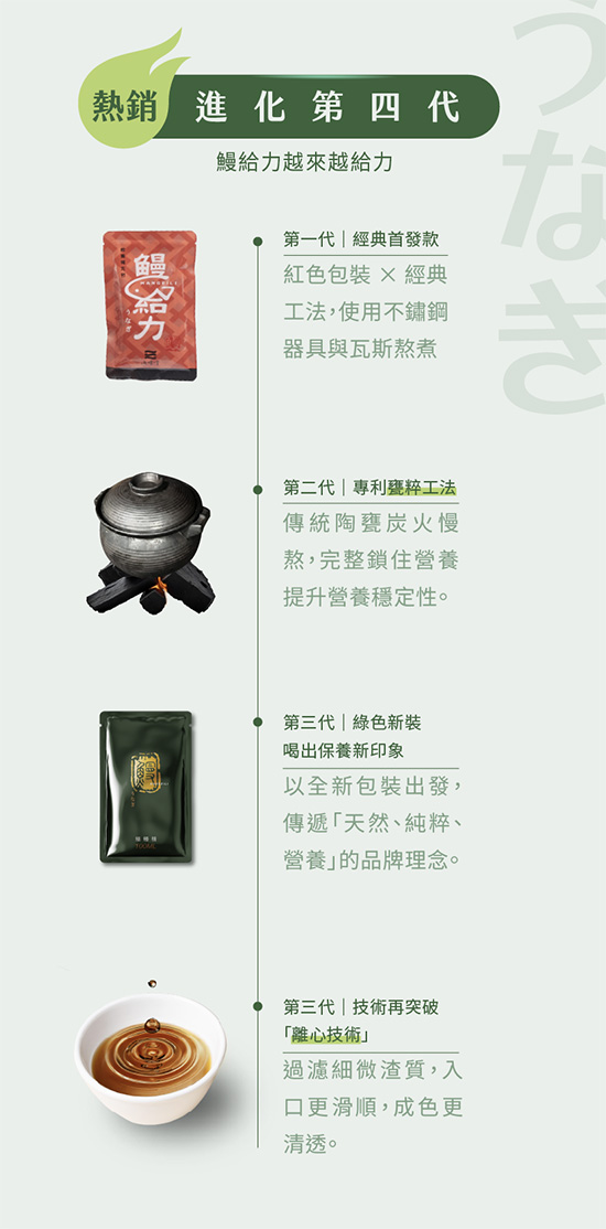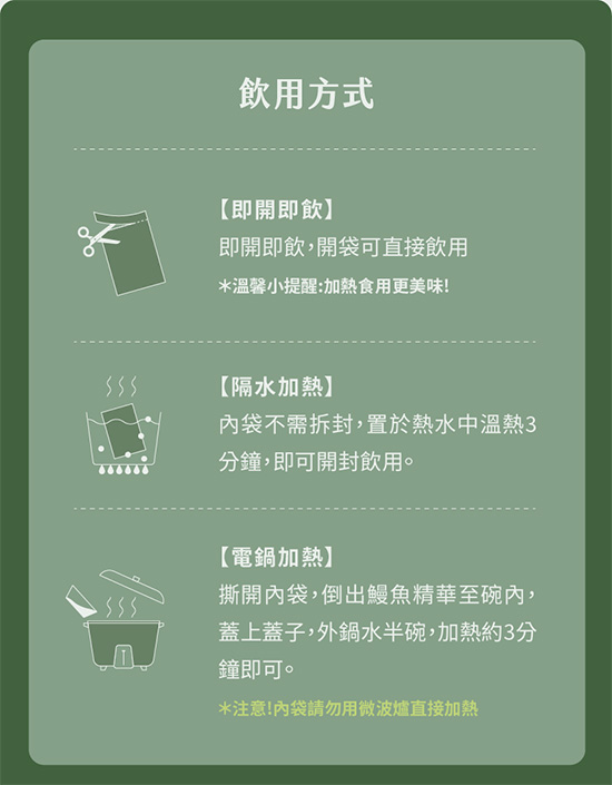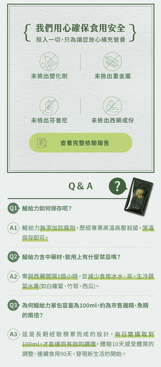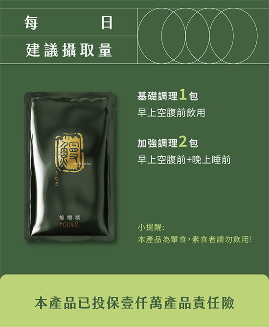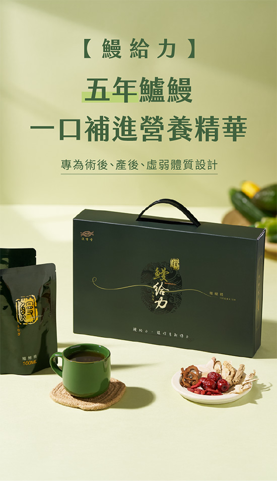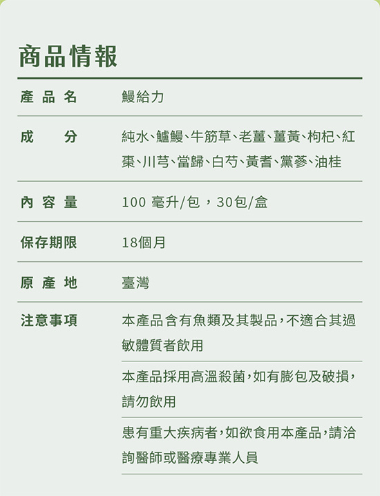 一包100毫升 一組10包 術後、產後的最佳營養補充包 喝完讓您重新得力、快速恢復! 也是專為勤奮工作的你而設計 給你鱸鰻全方位的營養素 讓你放鬆又得力!