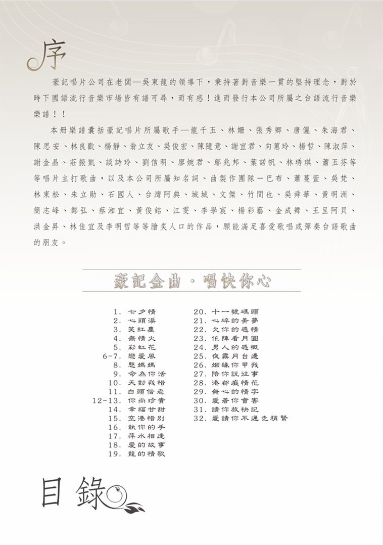 本書擁有最新.最流行的台語經典歌曲之簡譜 30首台語精選好歌、讓您一本全擁有 專業歌唱班指定愛用! 歡迎 歌唱班老師、社區大學 配合。 - - - - - - - - - - - - - - - - - - !大量訂購,另有優惠! - - - - - - - - - - - - - - - - - - 豪記龍虎榜 流行樂譜No.35 搭配卡拉OK伴唱機 練唱也能很簡單! ↓卡拉OK伴唱機 購買網址↓ http://www.twkaraoke.com.tw/pro_area.aspx?area=123 年輕人最愛 點將家手提卡拉OK伴唱機 http://www.twkaraoke.com.tw/pro_info.aspx?pro=2817 豪記群星 共同推薦『豪記金曲龍虎榜流行樂譜』 七夕情/心頭淚/笑紅塵/無情火 譜 簡譜/彩虹花/戀愛風/憨媽媽/命為你活/天對我惜 歌譜 譜/白頭偕老/你尚珍貴/幸福甘甜/空港惜別 歌譜 樂譜/執你的手/萍水相逢/愛的故事/龍的情歌 簡譜/十一號碼頭/心碎的美夢/欠你的感情/作陣看月圓 樂譜/男人的感慨/夜霧月台邊/姻緣你甲我/陪你說往事 簡譜 譜/港都癡情花/無心的情字/愛著你會害/請你放袂記/愛請你不通走稍緊 歌譜/樂譜/簡譜 目錄 七夕情 心頭淚 笑紅塵 無情火 彩虹花 戀愛風 憨媽媽 命為你活 天對我惜 白頭偕老 你尚珍貴 幸福甘甜 空港惜別 執你的手 萍水相逢 愛的故事 龍的情歌 十一號碼頭 心碎的美夢 欠你的感情 作陣看月圓 男人的感慨 夜霧月台邊 姻緣你甲我 陪你說往事 港都癡情花 無心的情字 愛著你會害 請你放袂記 愛請你不通走稍緊 七夕情/心頭淚/笑紅塵/無情火 譜 簡譜/彩虹花/戀愛風/憨媽媽/命為你活/天對我惜 歌譜 譜/白頭偕老/你尚珍貴/幸福甘甜/空港惜別 歌譜 樂譜/執你的手/萍水相逢/愛的故事/龍的情歌 簡譜/十一號碼頭/心碎的美夢/欠你的感情/作陣看月圓 樂譜/男人的感慨/夜霧月台邊/姻緣你甲我/陪你說往事 簡譜 譜/港都癡情花/無心的情字/愛著你會害/請你放袂記/愛請你不通走稍緊 歌譜/樂譜/簡譜 另有更多經典歌曲歌譜 暢銷卡拉OK伴唱機 ~歡迎來電洽詢~
