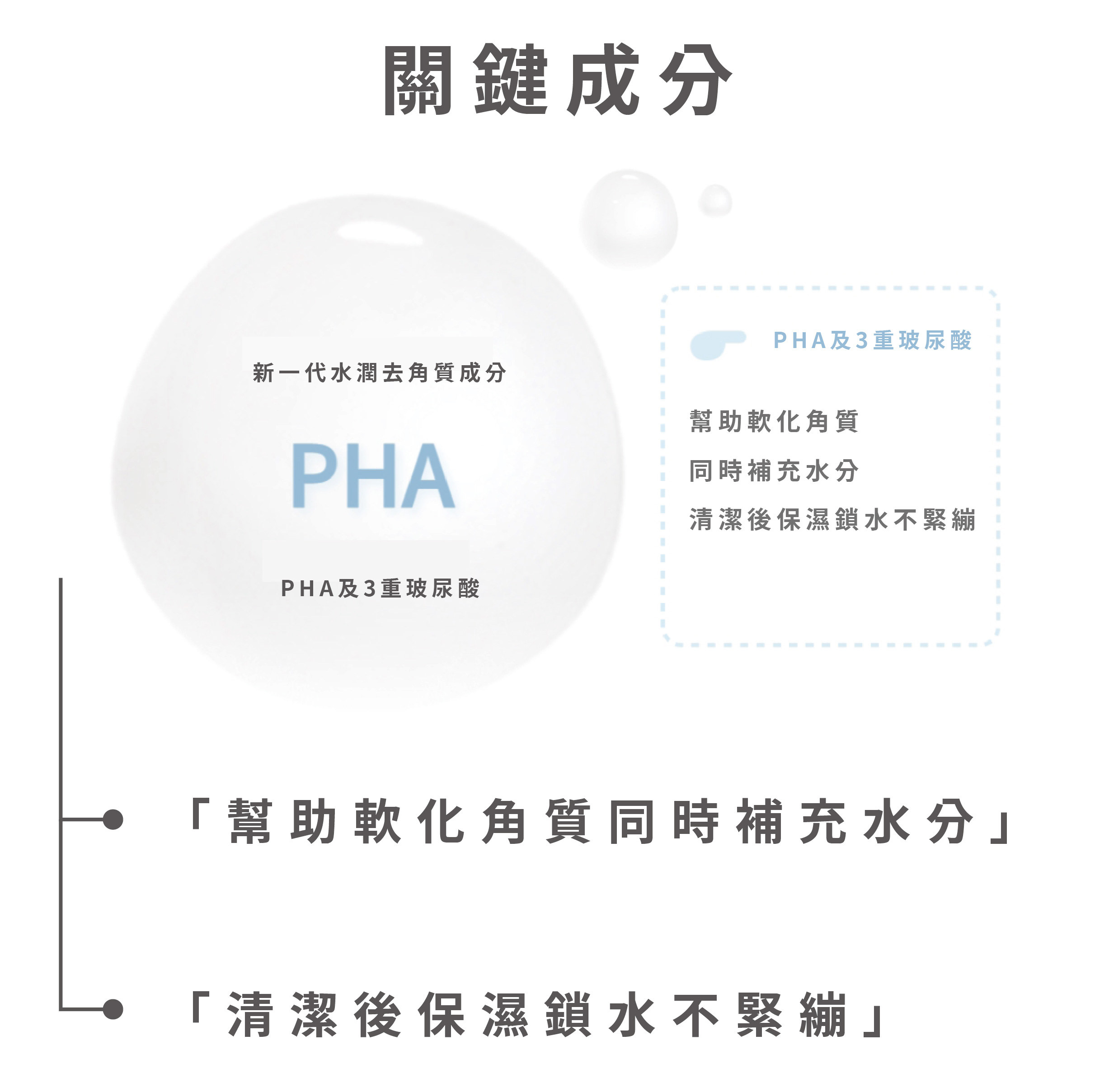 ✅採用新一代水潤去角質成分PHA及3重玻尿酸,幫助軟化角質同時補充水分,清潔後保濕鎖水不緊繃