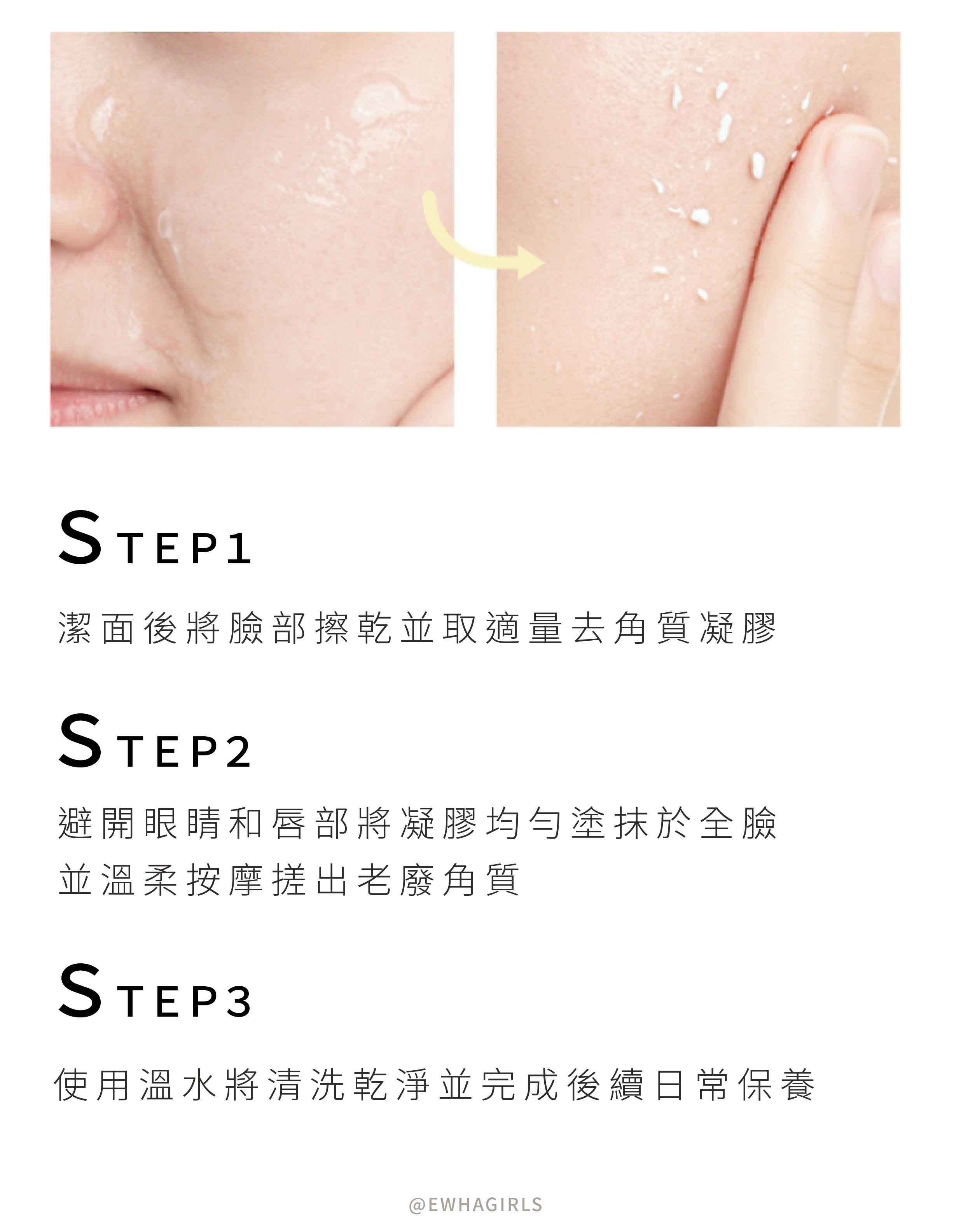 避開眼睛和唇部將凝膠均勻塗抹於全臉並溫柔按摩搓出老廢角質