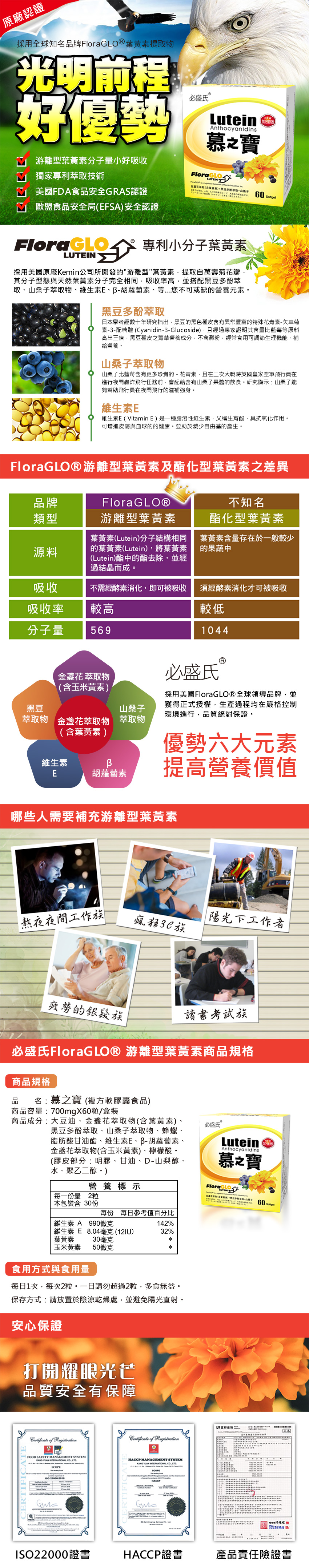 ◆商品名稱:慕之寶加強版60粒X1盒 ◆產品規格:700mgX60粒/盒裝 ◆商品成份: 大豆油、金盞花萃取物(含葉黃素)、黑豆多酚萃取、山桑子萃取物、蜂蠟、脂肪酸甘油酯、維生素E、胡蘿蔔素、金盞花萃取物(含玉米黃素)、檸檬酸;(膠皮部分:明膠、甘油、D-山梨醇、水、聚乙二醇)。 ◆食用方式與食用量: