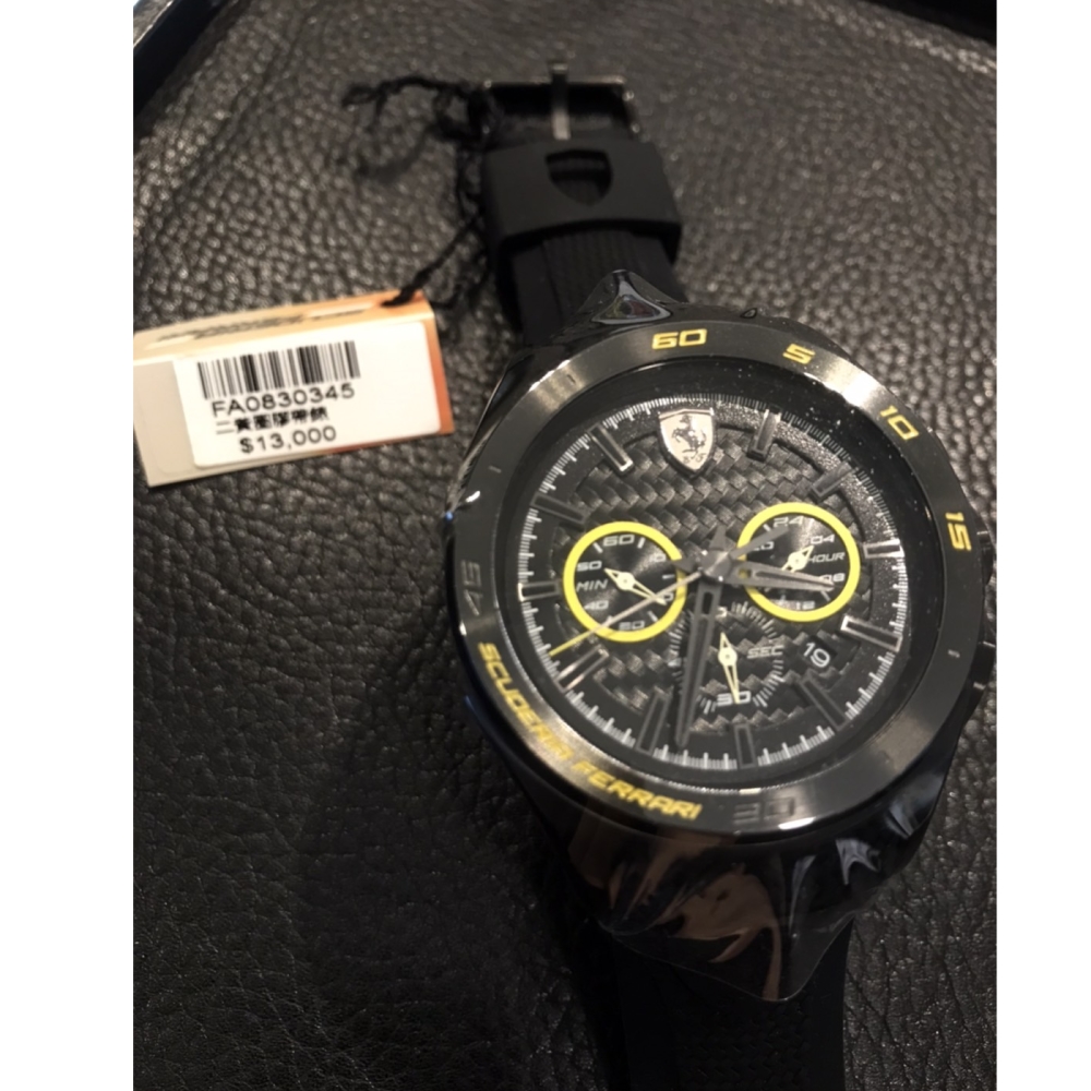 FERRARI Scuderia 0830345 FERRARI源自義大利的時尚品牌 錶款中結合賽車與品牌的熱血精神 奢華獨特的經典設計款式 採用防刮礦石水晶鏡面及極致的材質打造 品牌的影響力及奢華高質感的設計與材質深受喜愛 ※基本資料※ 原廠公司貨,附原廠精緻錶盒,原廠保證書 ※基本資料※ 機芯:原廠石英機芯 動力:電池 ※規格※ 錶殼:厚度約1.1cm 錶殼:直徑約4.7CM 錶鏡:直徑約3.7cm 重量:約115G *顏色:錶盤:黑色系 錶帶:黑色系 錶框:黑色系 指針:鐵灰色 刻度:鐵灰系 材質:不鏽鋼 錶帶:橡膠材質 鏡面:礦石鏡面 防水:生活防水30米 ※其他規格※ 錶扣:一般錶扣 防水:生活防水30米 原廠公司貨,附原廠精緻錶盒,原廠保證書