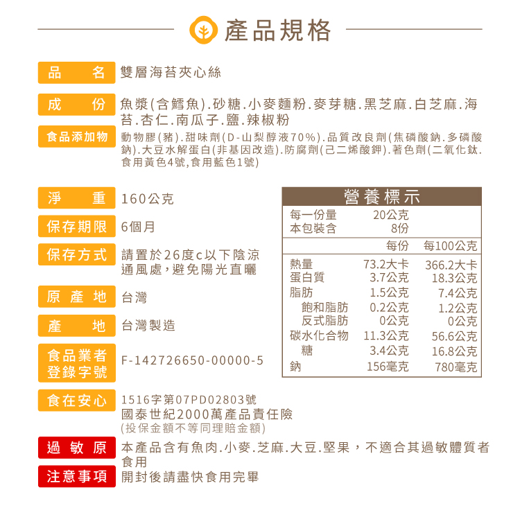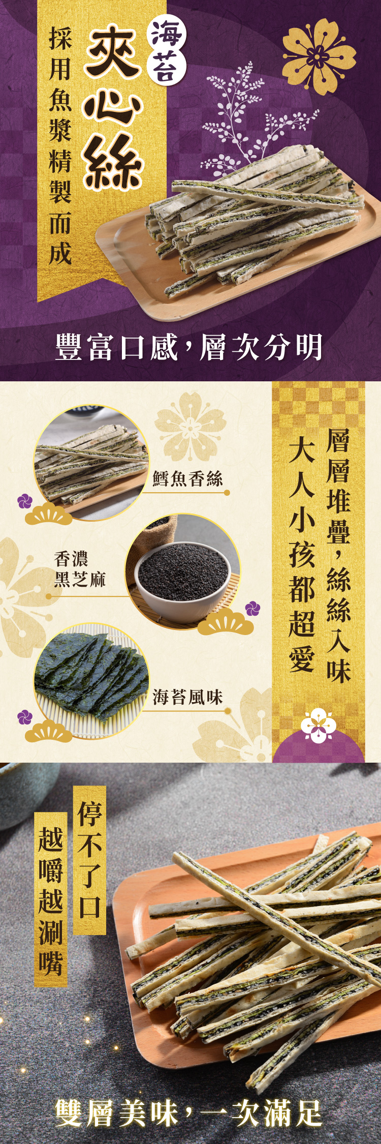 【年貨預購】*雙層鱈魚香絲,再加上黑芝麻、海苔夾心調味,絲絲入味!是聊天、泡茶最佳良伴!