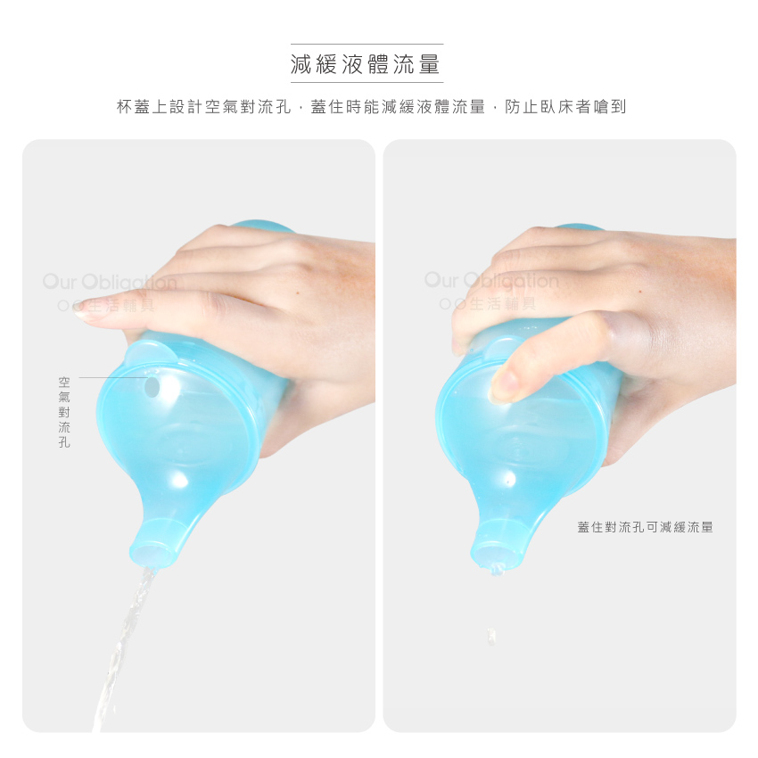 杯蓋上設計空氣對流孔,蓋住時能減緩液體流量,防止臥床者嗆到