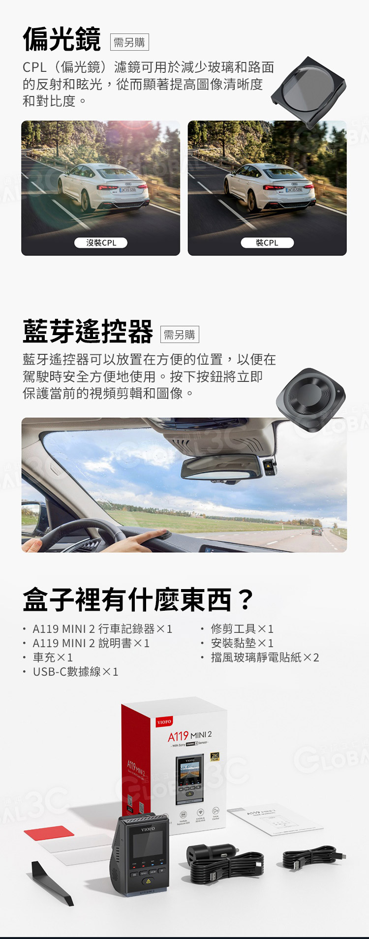 ◆可加購配件: CPL 圓偏光鏡片、藍牙遙控器、HK4 Acc停車監控降壓電源線
