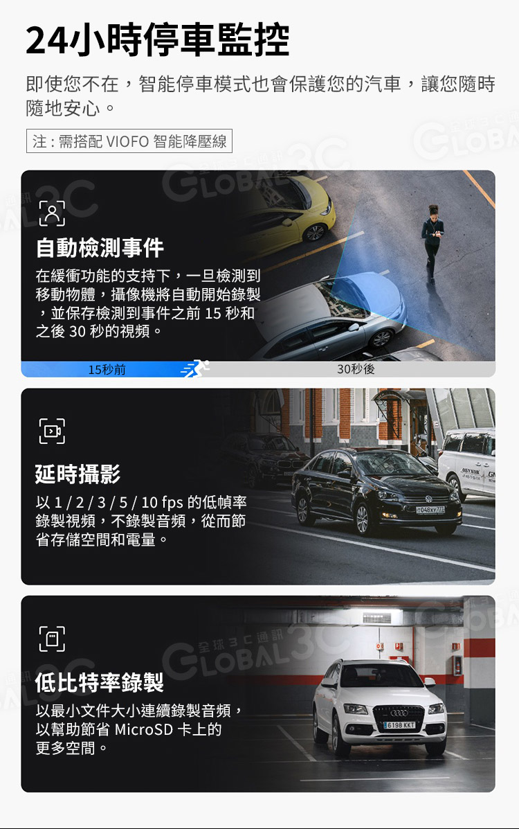 ◆【緩衝停車模式】緩衝停車模式將能夠記錄導致撞擊/運動的事件。車載攝像頭將在事件發生前和事件發生後30秒之間保存15秒的影像。這是一項出色的功能,可完成真正的停車模式,因為在觸發任何錄音之前,都會有很多重要信息。要使用停車模式,需要購買VIOFO HK4降壓電源線。