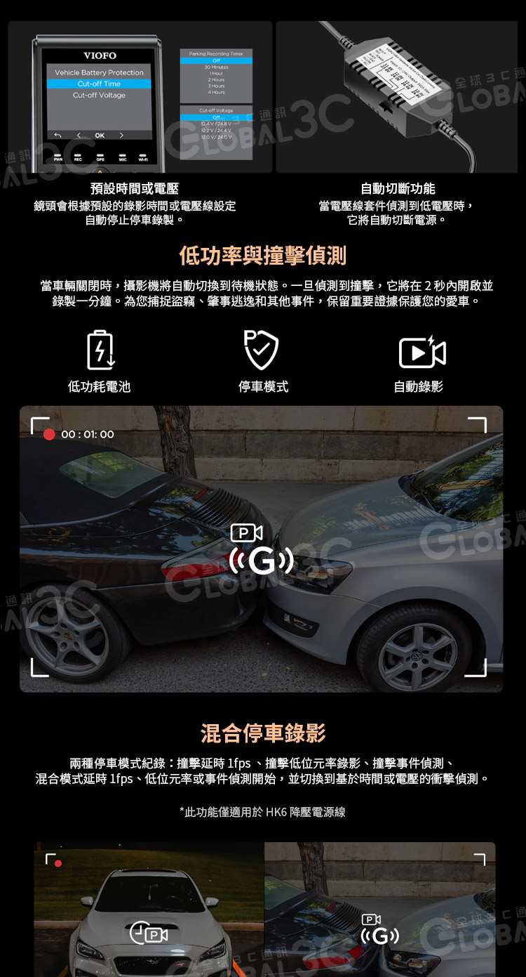 2. 【緩衝停車模式】車載攝影鏡頭將存在事件發生前15秒和事件發生後30秒之間的影像,即時還原導致撞擊/運動的事件。要使用停車模式,需另購買VIOFO HK4降壓電源線。