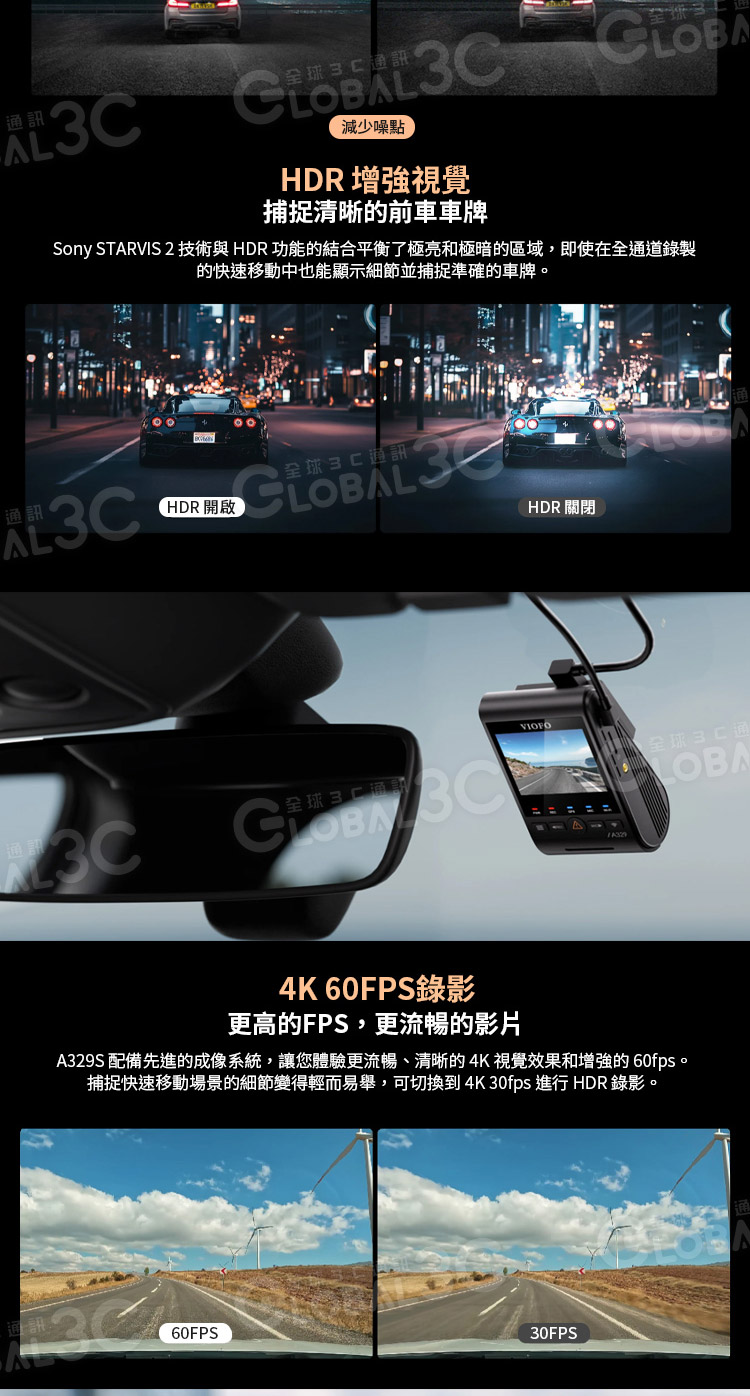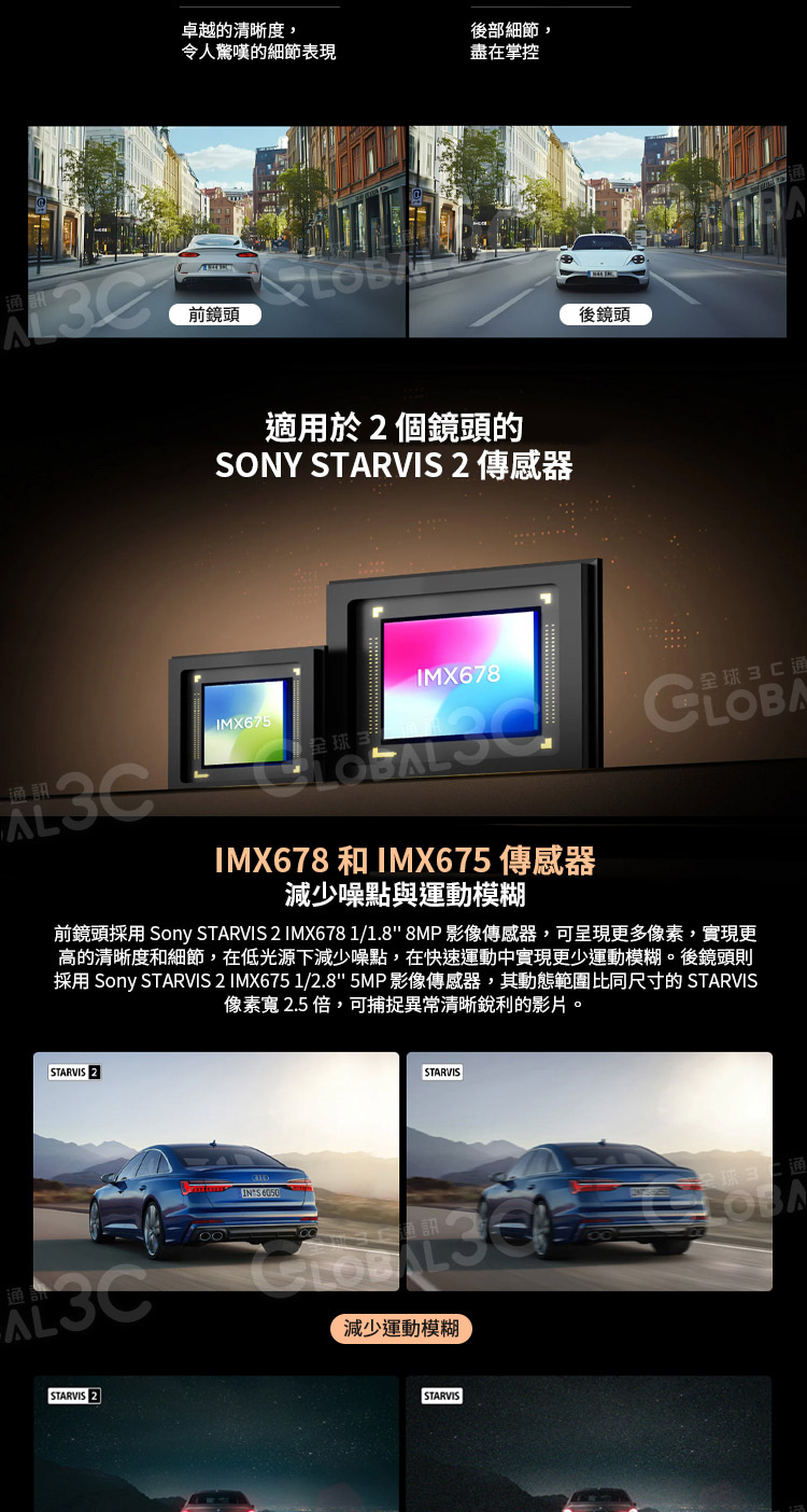 1.【升級的HDR增強視覺】配備兩台STARVIS 2圖像傳感器,Sony STARVIS 2 技術與 HDR 功能的結合平衡了極亮和極暗的區域,即使在全通道錄製的快速移動中也能顯示細節並捕捉準確的車牌。