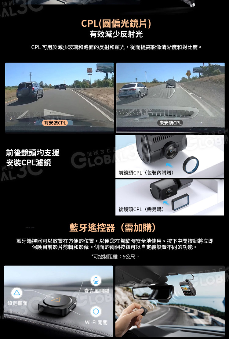 可加購配件:CPL600偏光鏡、BTR200藍牙遙控器、停車監控降壓電源線
