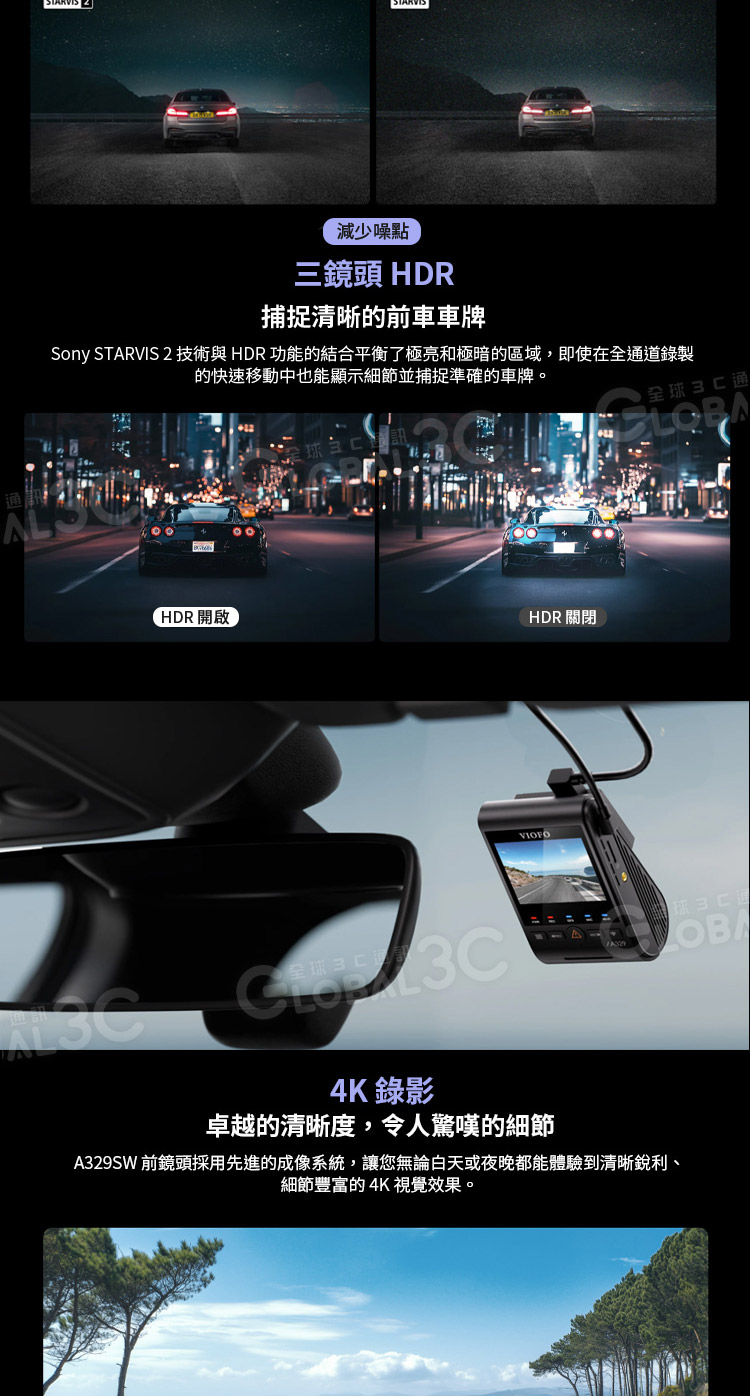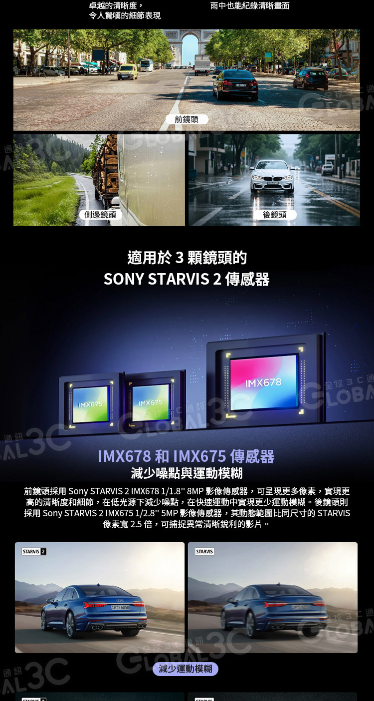 1.【升級的HDR增強視覺】配備三台STARVIS 2圖像傳感器,Sony STARVIS 2 技術與 HDR 功能的結合平衡了極亮和極暗的區域,即使在全通道錄製的快速移動中也能顯示細節並捕捉準確的車牌。