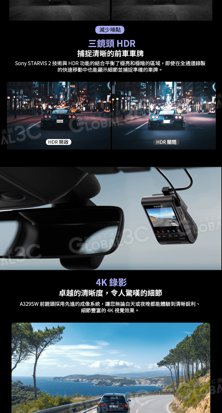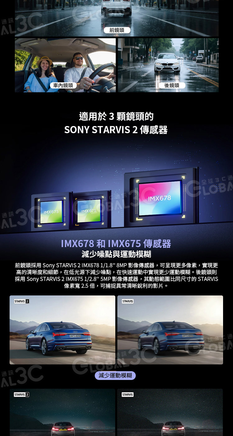 1.【升級的HDR增強視覺】配備三台STARVIS 2圖像傳感器,Sony STARVIS 2 技術與 HDR 功能的結合平衡了極亮和極暗的區域,即使在全通道錄製的快速移動中也能顯示細節並捕捉準確的車牌。