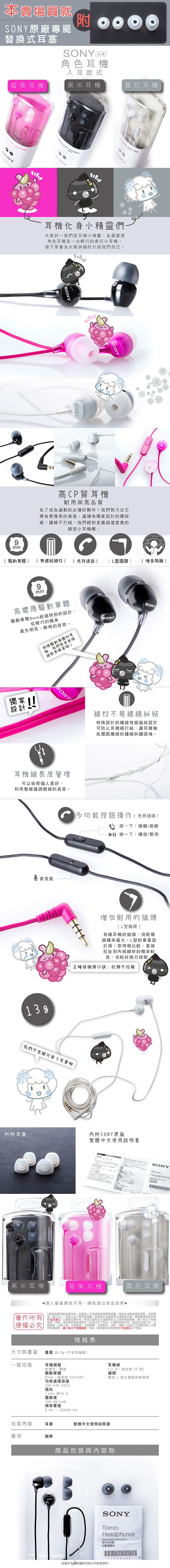 SONY 角色系列【雪花/黑米/莓果耳機】 入耳式 線控 麥克風 【公司貨保固】