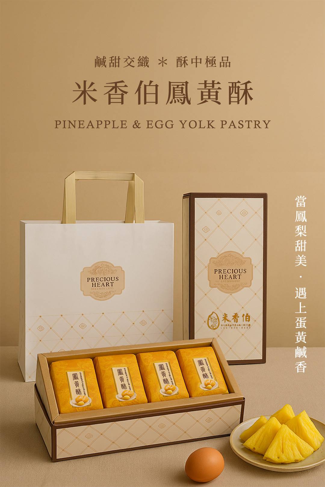 米香伯以細膩工藝與典雅包裝, 封存每一口甜中帶鹹的美好。 無論節慶送禮、長輩探望或企業贈禮, 都傳遞出誠摯祝福與溫厚情感。 香甜土鳳梨餡 與 鹹香蛋黃 的命運交織 比例講究、層次分明,入口餘韻帶著微酸清香 每日手工限量製作,只為保留傳統好滋味 每塊獨立包裝,將新鮮與美味牢牢封存 方便攜帶,也方便分享、送禮 一份剛好的心意,從打開那一刻開始 從選蛋、醃製、烘烤,到包成內餡... 每一顆蛋黃,都是我們自己一步步做出來的 堅持自製,只為讓你吃的安心 品名:鳳黃酥禮盒 成分:麵粉、蛋、土鳳梨餡、牛奶、奶油、砂糖 淨重:400克/盒 容量:8入一盒 葷素:蛋奶素 過敏原:澱粉、蛋、奶 保存期限:常溫35天 有效期限:標示於包裝上