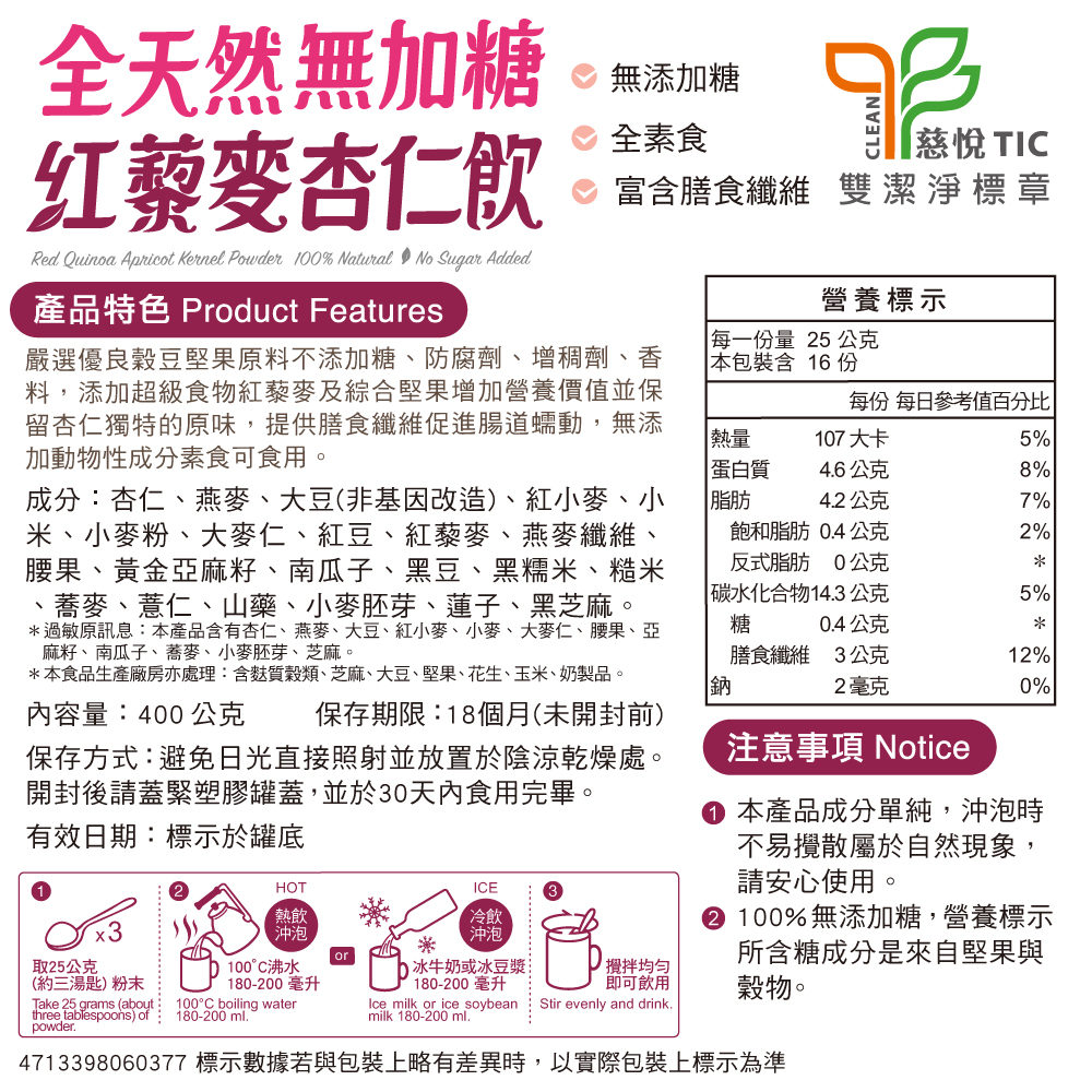6. 【馬玉山】全天然無加糖紅藜麥杏仁飲400g 冷泡/沖泡/穀粉/富膳食纖維/無添加糖/全素食