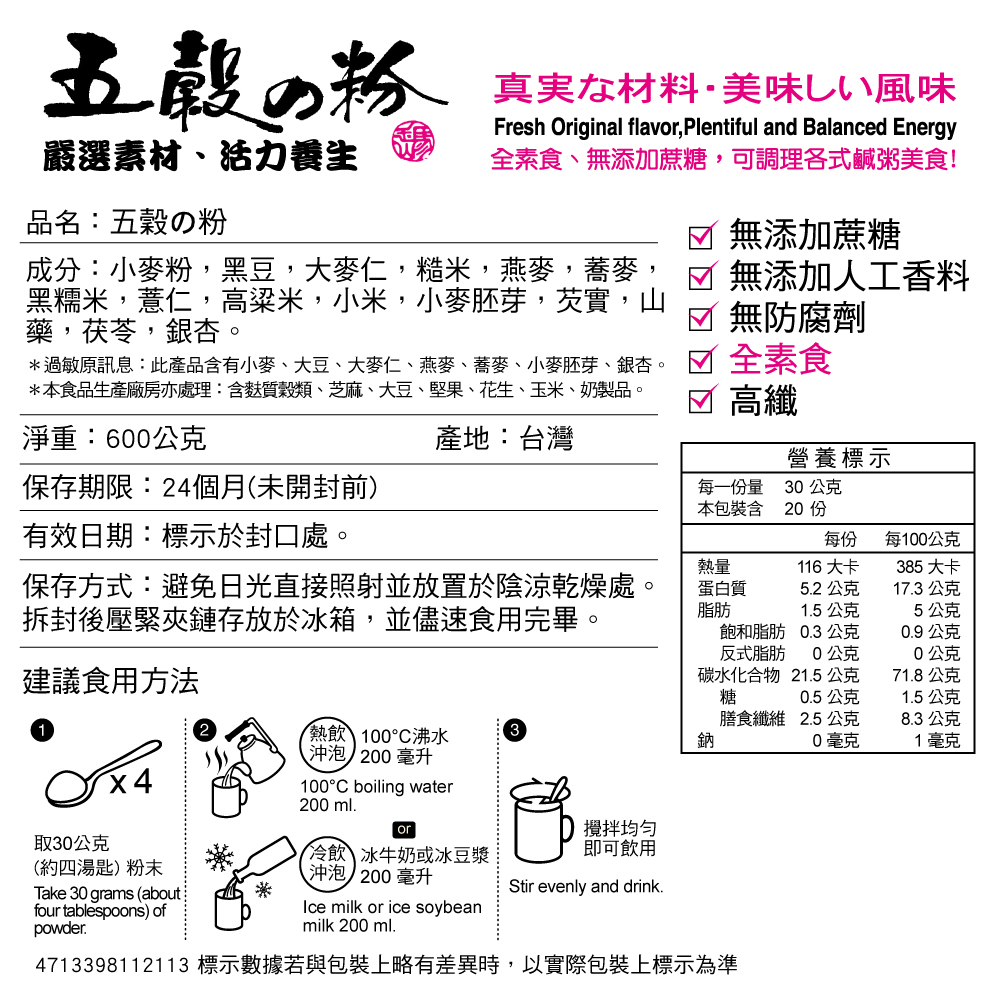 ★全素食 ★高纖 ★無添加蔗糖 ★無添加人工香料 ★冷熱沖泡均可 ★台灣製造