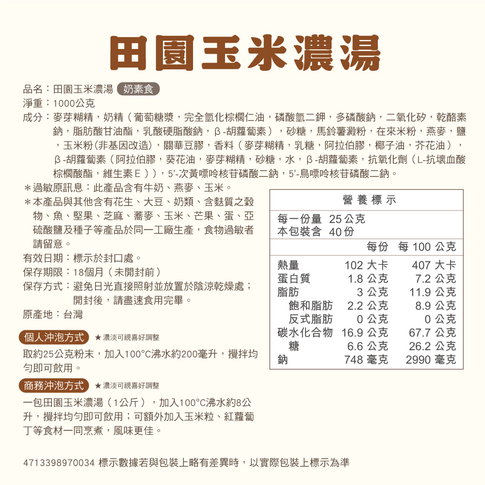 【馬玉山】田園玉米濃湯1kg(包) 沖泡/大包裝/奶素食/台灣製造 0
