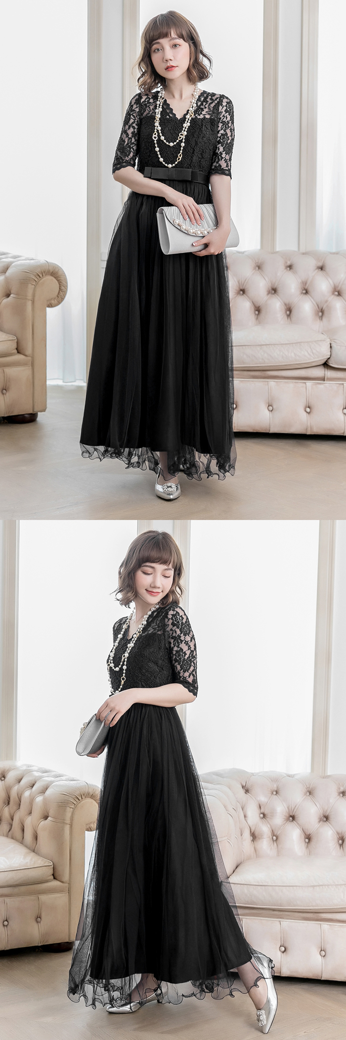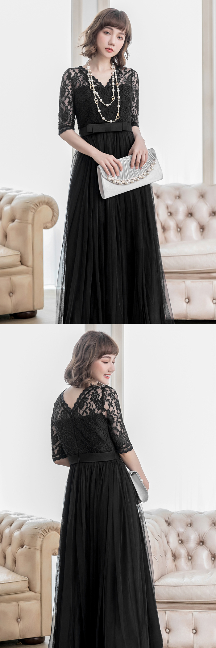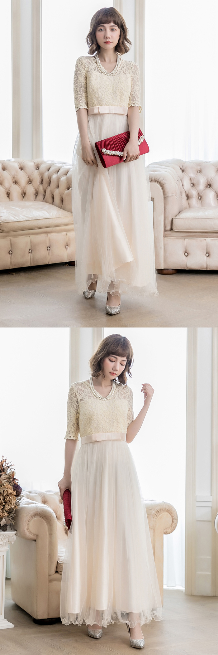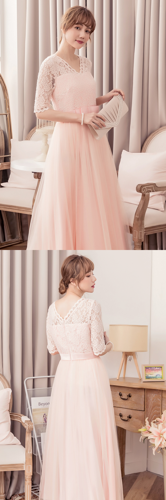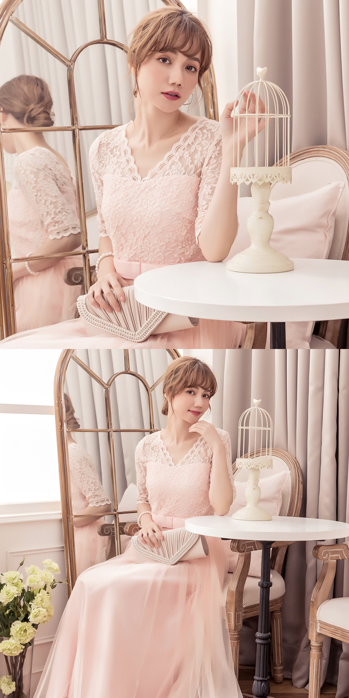 灰姑娘[88136-S]V領玫瑰蕾絲高雅綢緞網紗長裙五分袖小禮服/伴娘服/尾牙