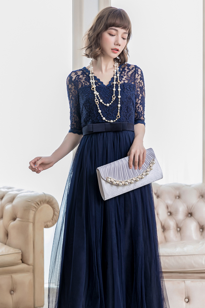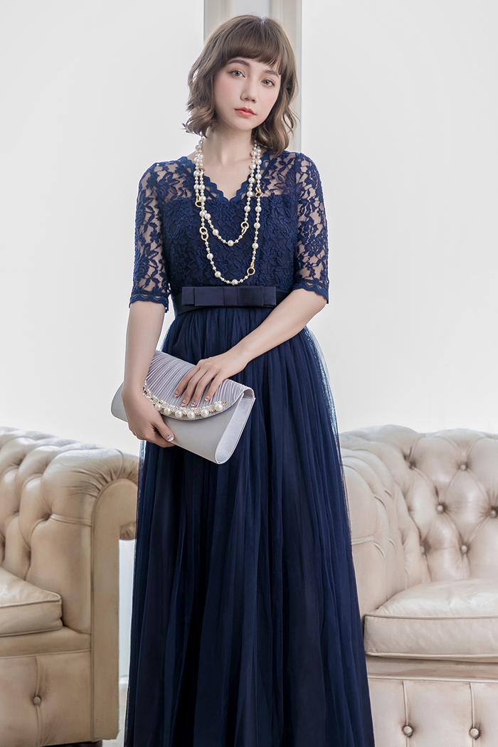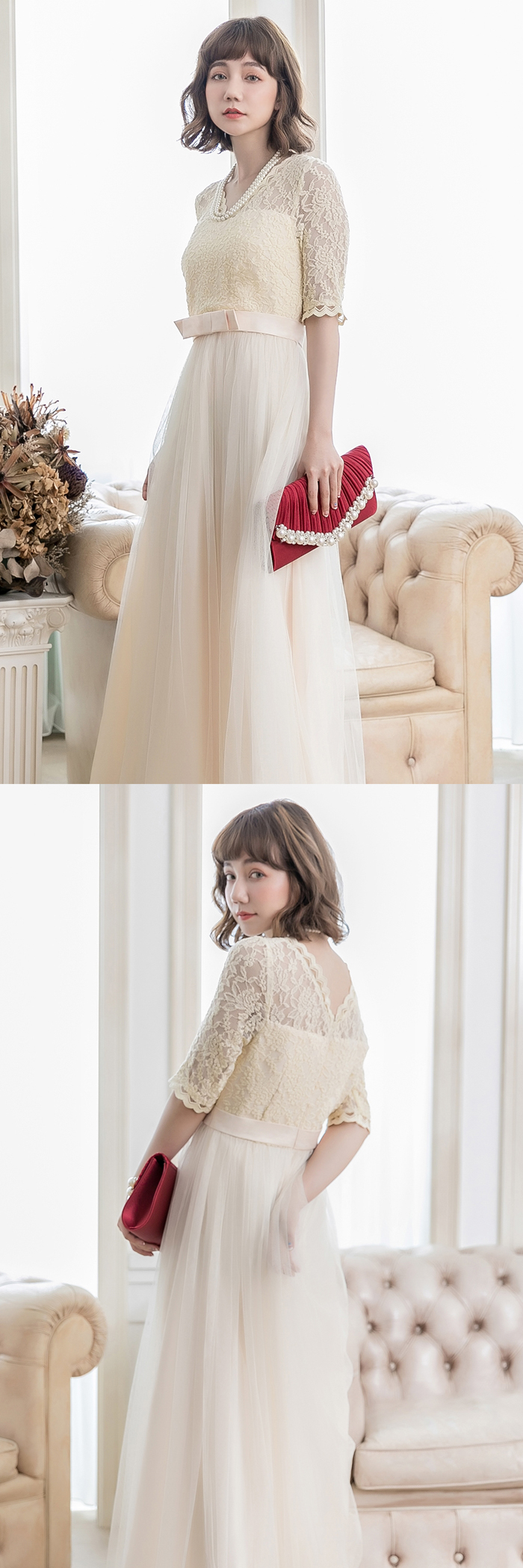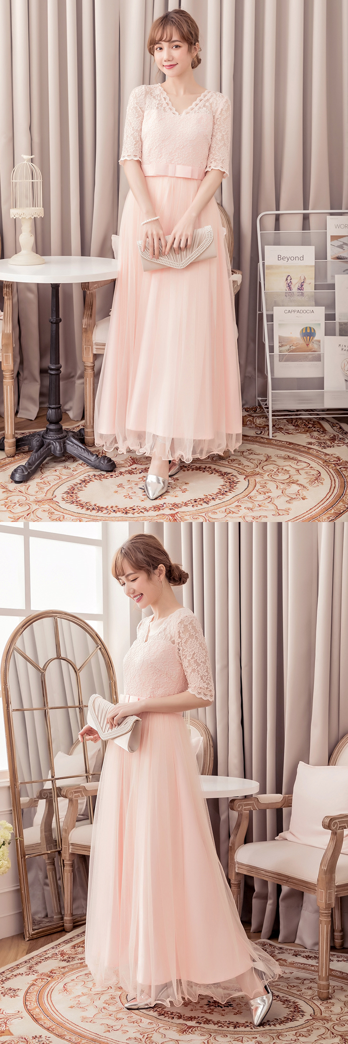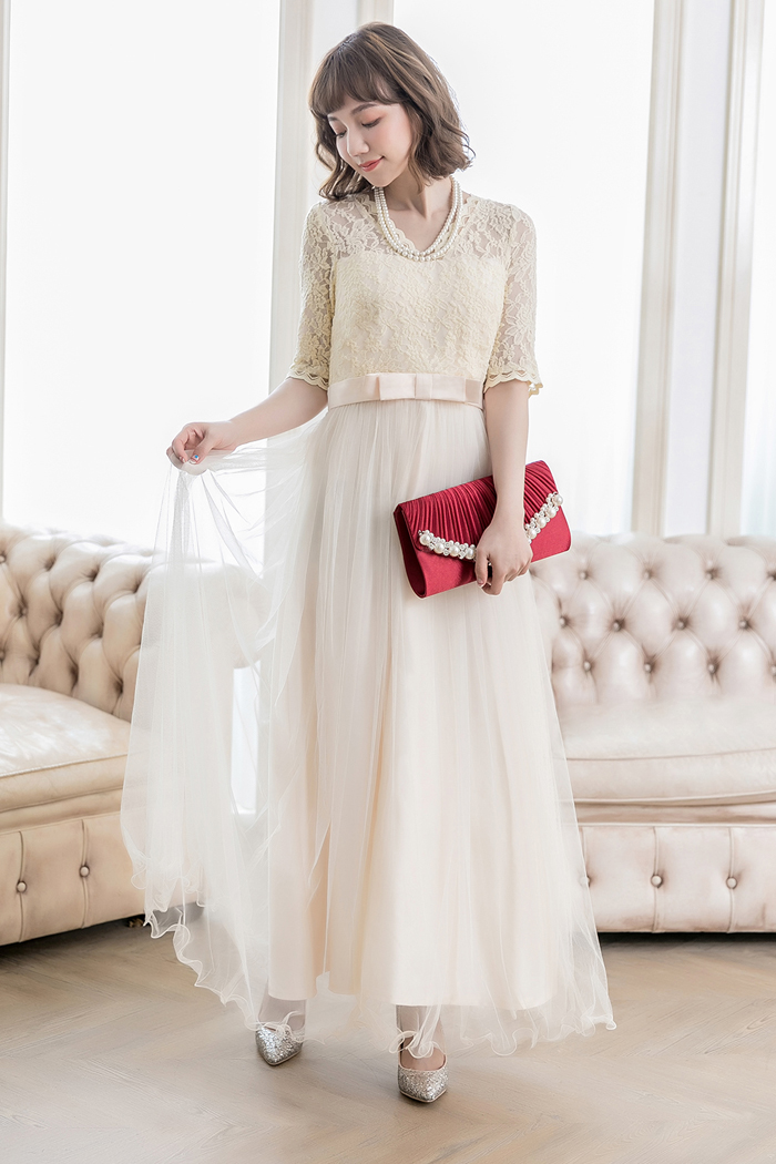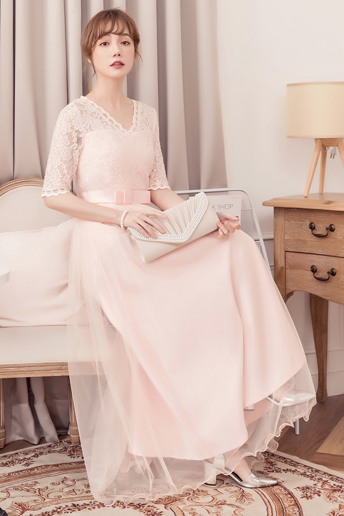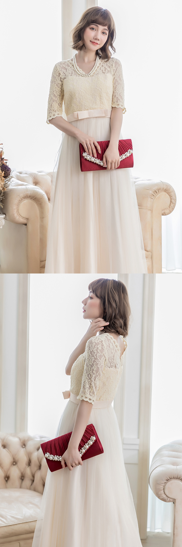 灰姑娘[88136-S]V領玫瑰蕾絲高雅綢緞網紗長裙五分袖小禮服/伴娘服/尾牙