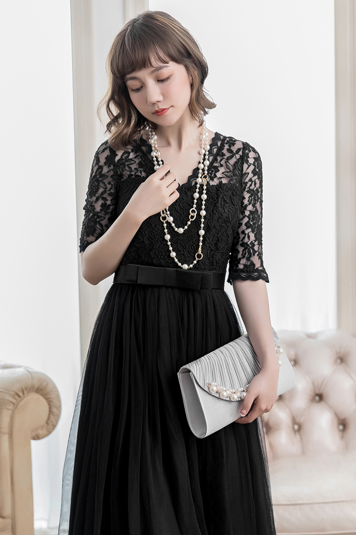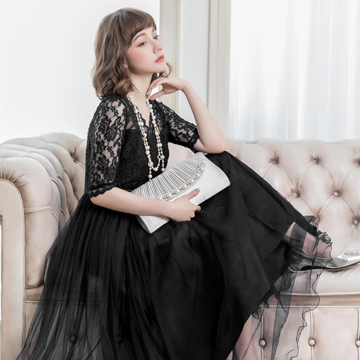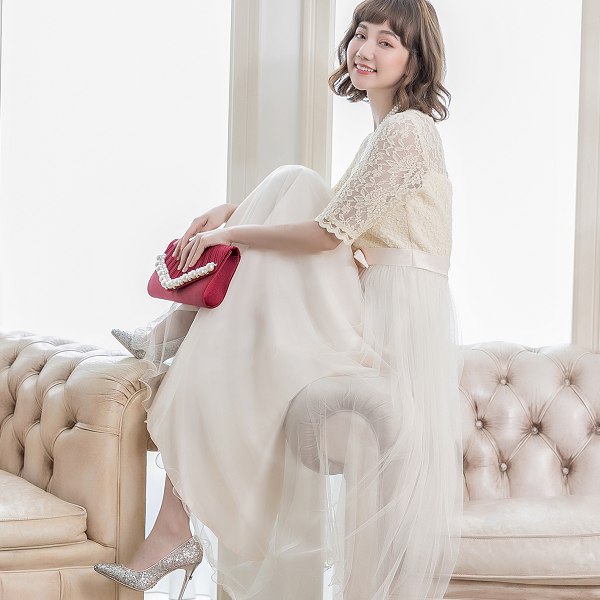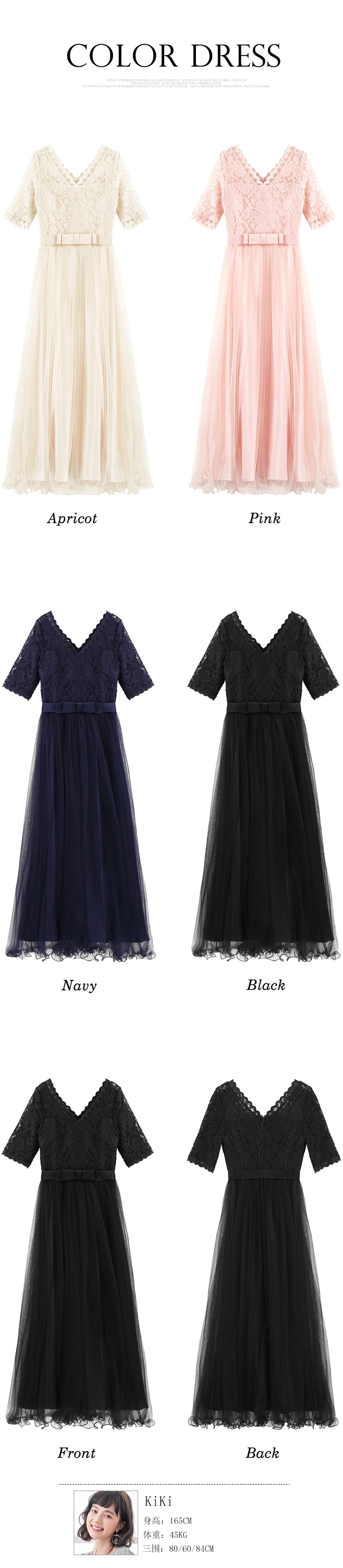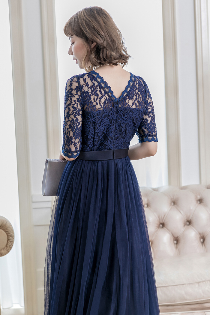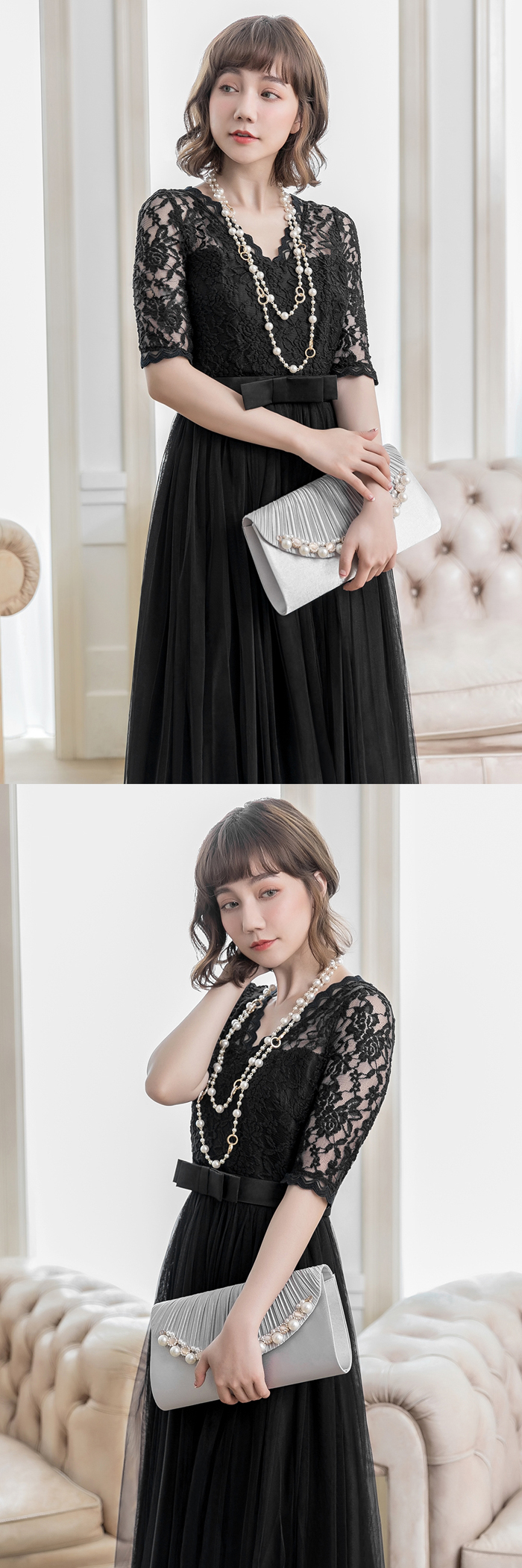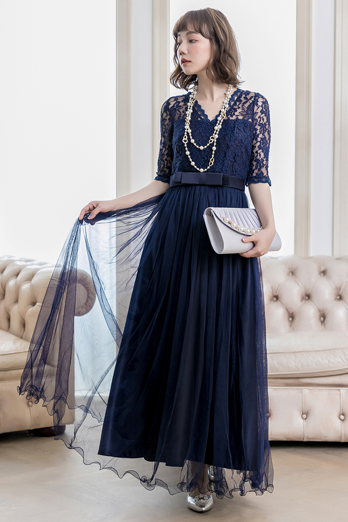 灰姑娘[88136-S]V領玫瑰蕾絲高雅綢緞網紗長裙五分袖小禮服/伴娘服/尾牙