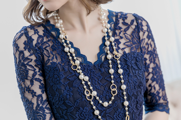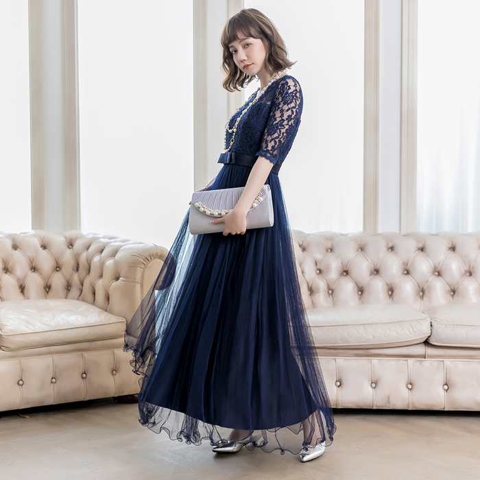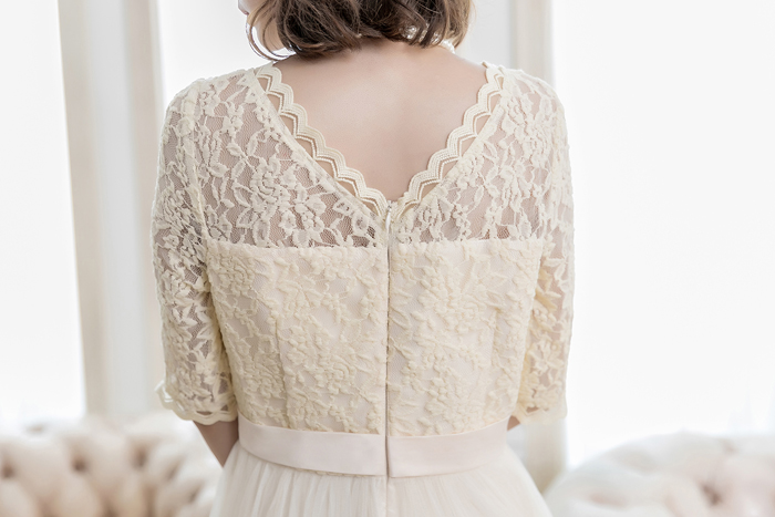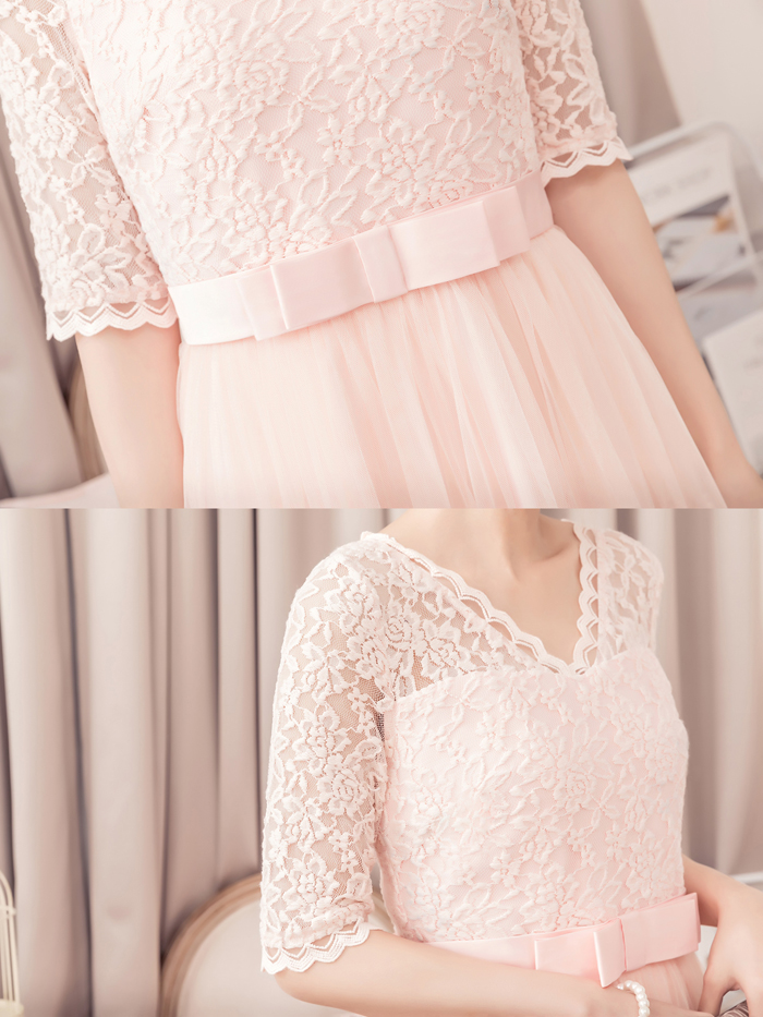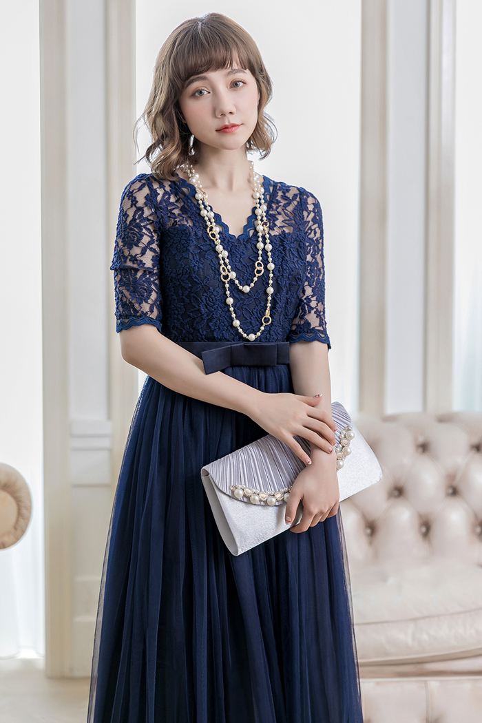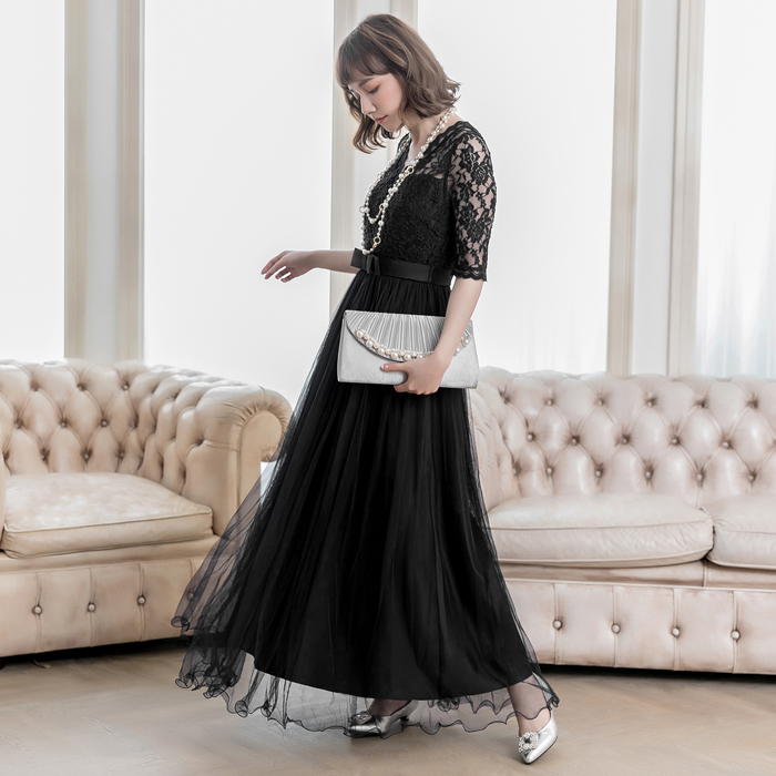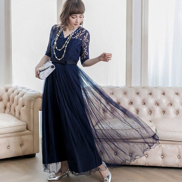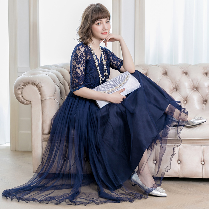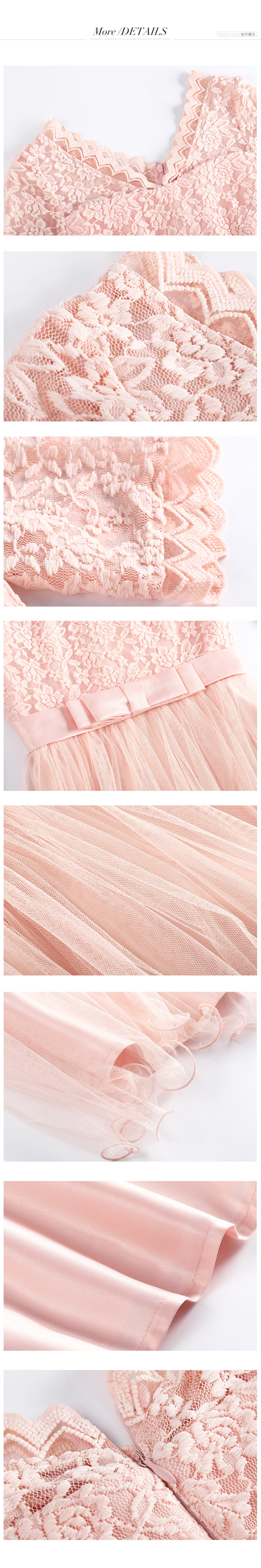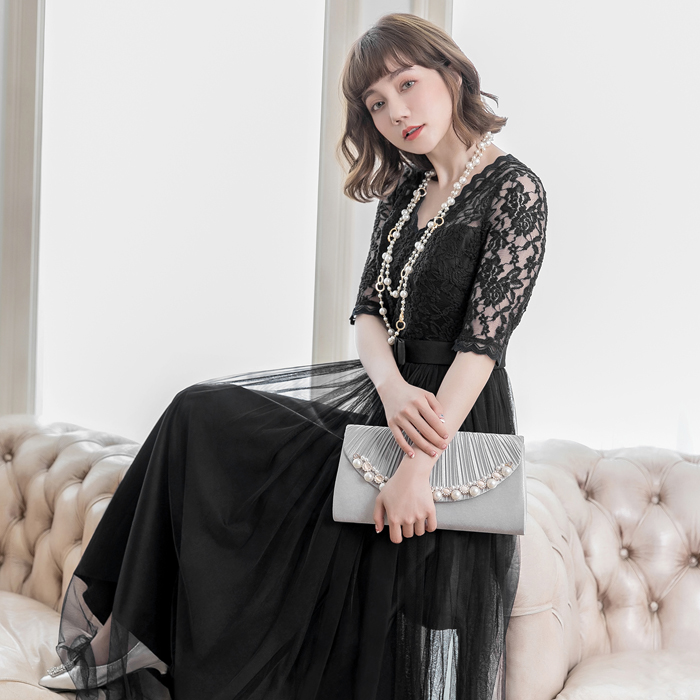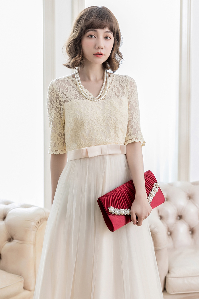 灰姑娘[88136-S]V領玫瑰蕾絲高雅綢緞網紗長裙五分袖小禮服/伴娘服/尾牙