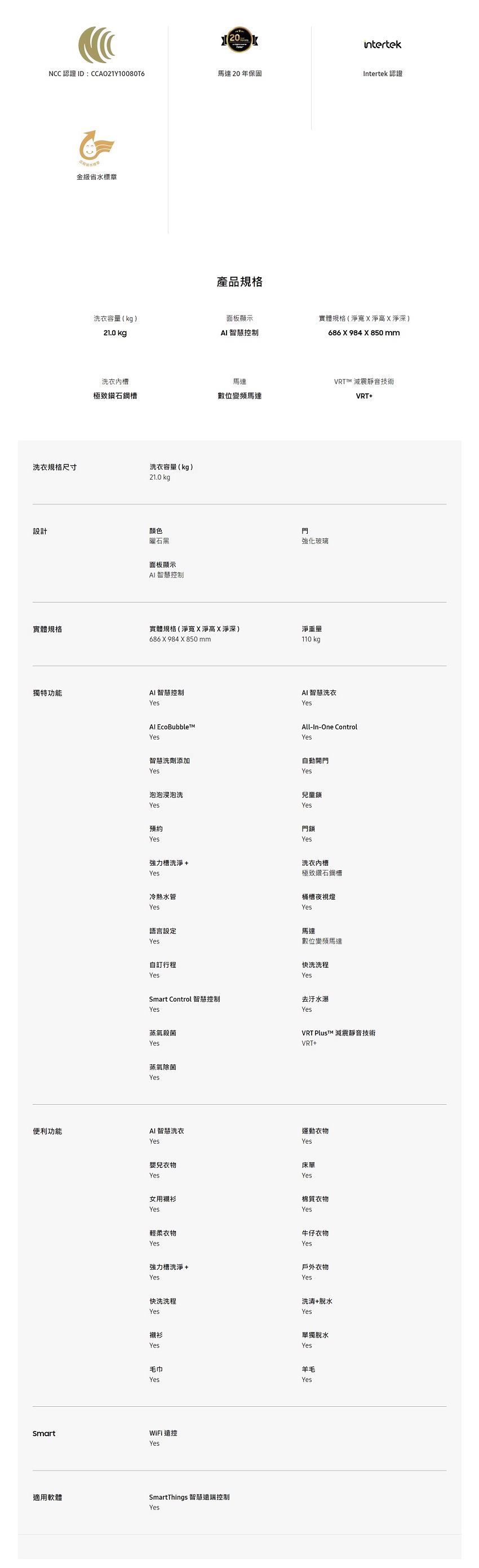 【12/31前登錄送1000元+全館領券再折】SAMSUNG三星 WF21B9600KV/TW 21KG 蒸洗脫 蒸本事滾筒洗衣機 BESPOKE系列 原廠公司貨