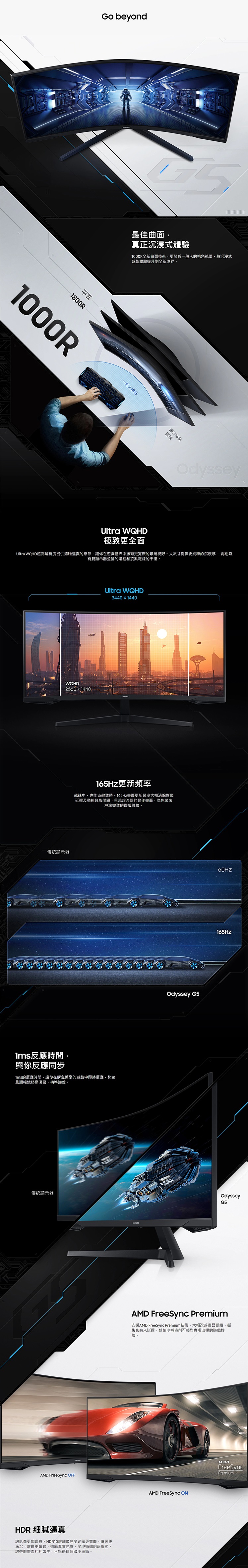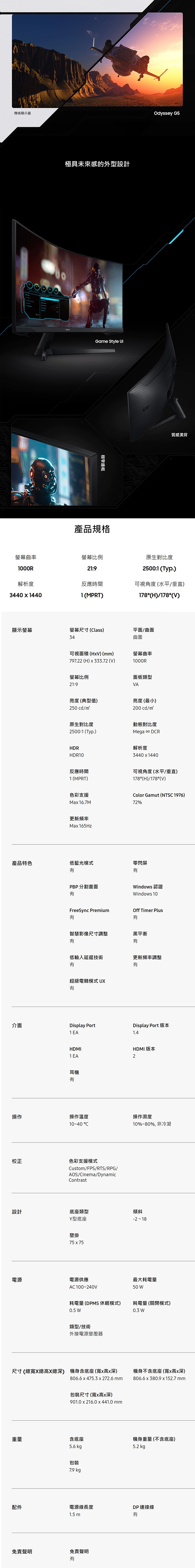 【12/31前月月抽手機+全館領券再折】Samsung 三星 34吋 Odyssey G5 1000R WQHD 曲面電競螢幕 C34G55TWWC