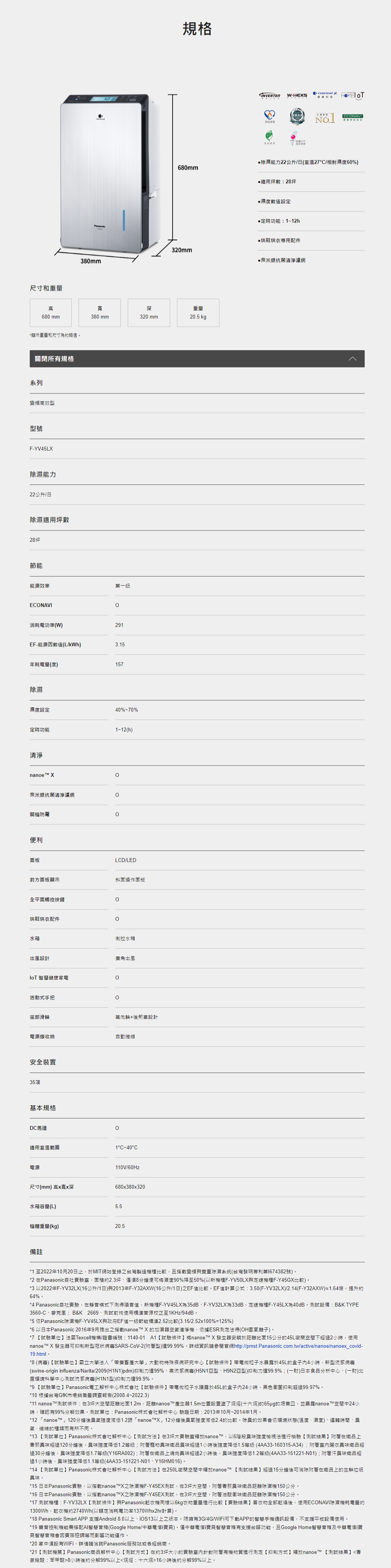 【全館領券再折】Panasonic 國際牌 F-YV45LX 22公升 變頻高效型除濕機 台灣公司貨