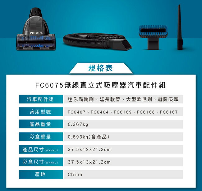 商品規格: PHILIPS飛利浦吸塵器車用清潔組 FC6075