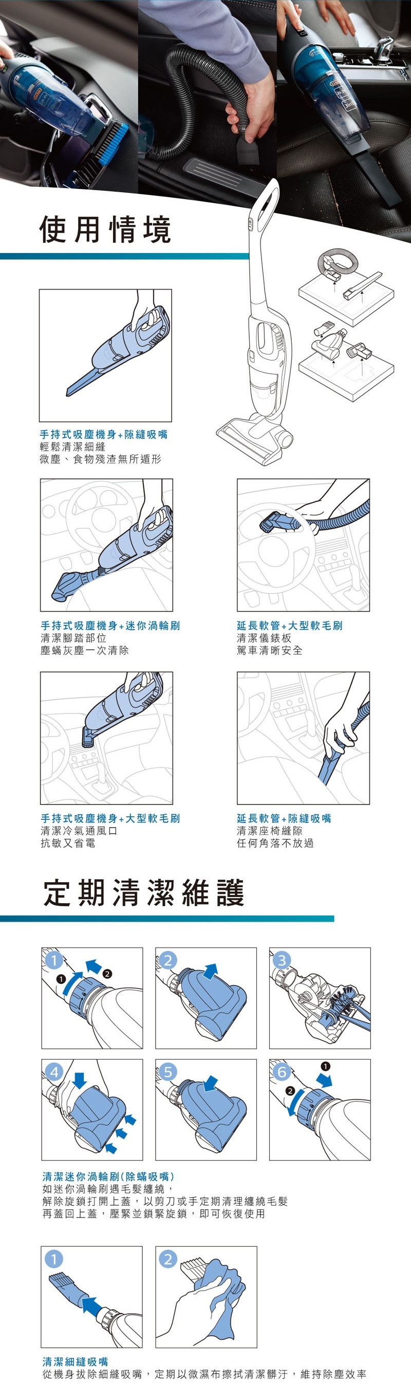 內含:迷你渦輪刷、延長軟管、大型軟毛刷、縫隙吸嘴。