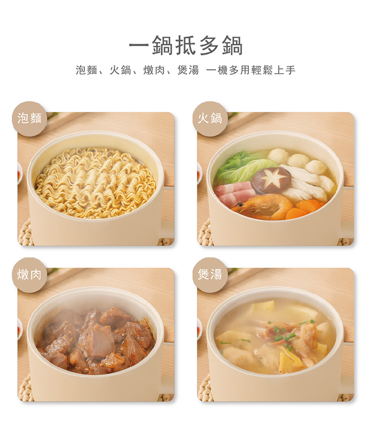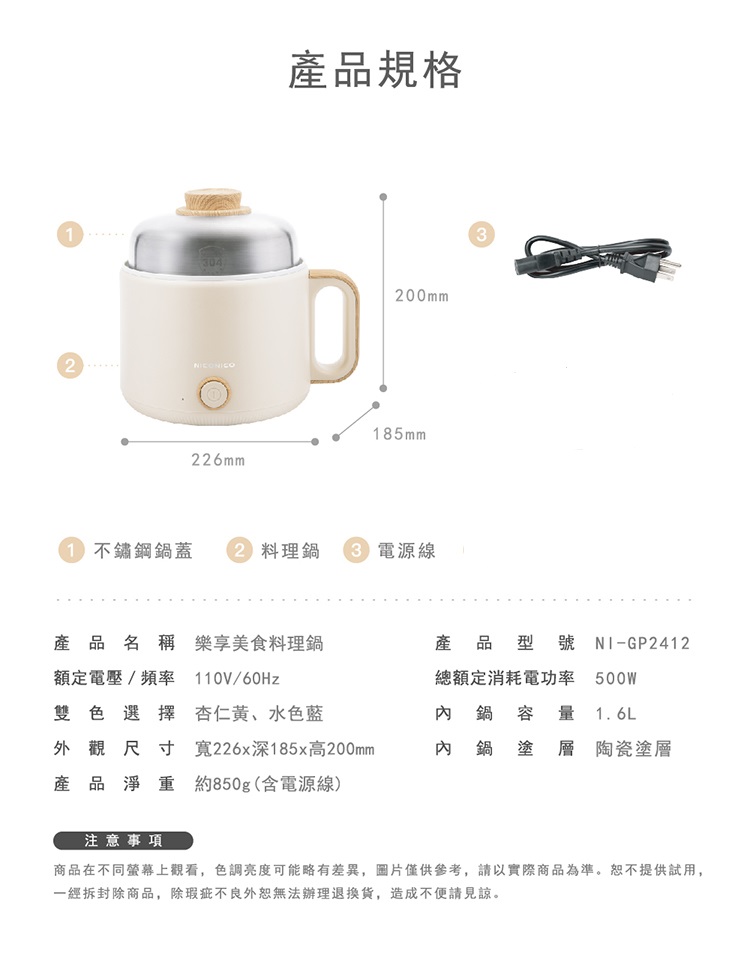 商品配件:主機x1、不鏽鋼鍋蓋x1、電源線x1、說明書x1、保固書x1