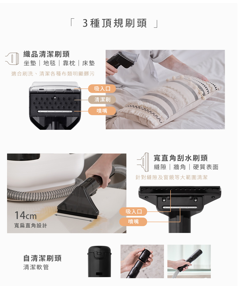 配件:主機、織品清潔刷頭、寬刮水刷頭、自清潔頭、1600ml清水箱、950ml污水箱、軟管、說明書
