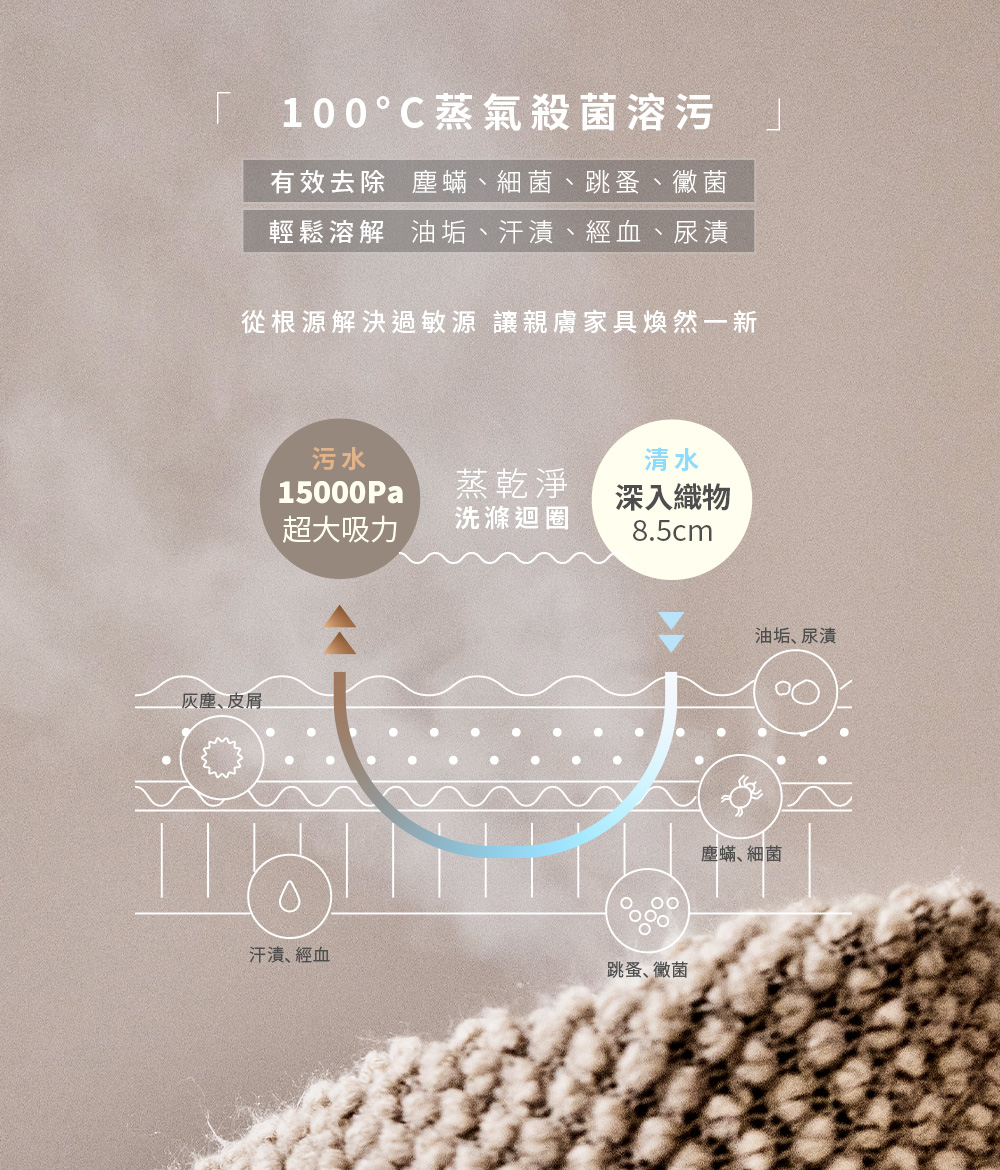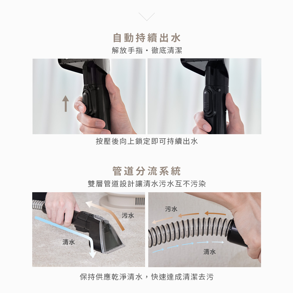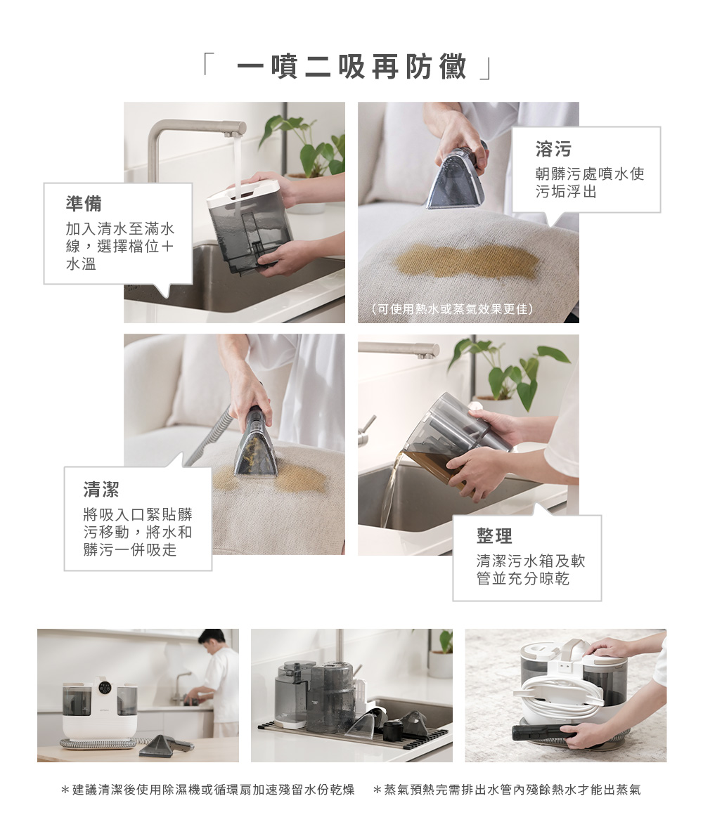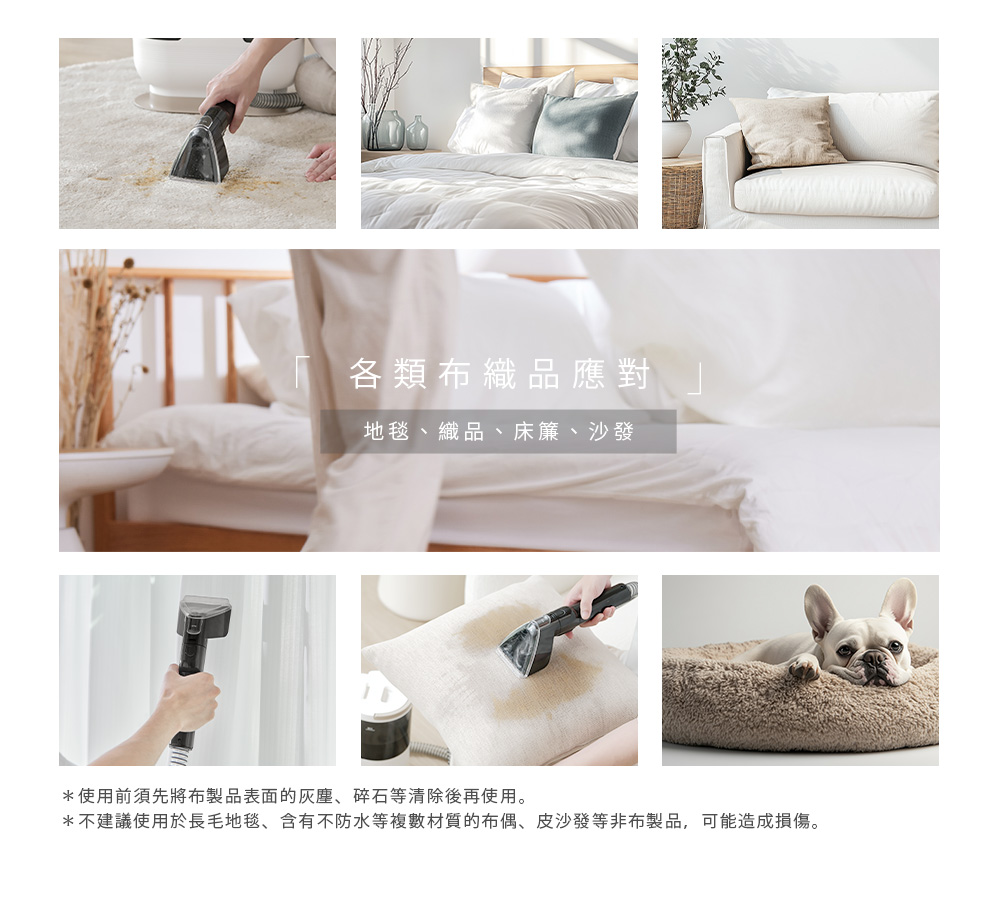 4. 不建議使用於長毛地毯,含有不防水等複數材質的布偶或皮沙發等非布製品,可能造成損傷。