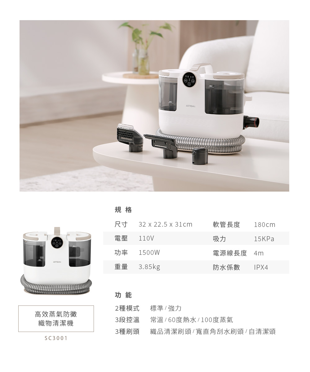 【新品首賣+贈7-11百元禮券】ARTISAN SC3001 奧堤森 高效蒸氣防黴織物清潔機 織物清洗機 地毯清潔 織品 床廉 沙發皆適用
