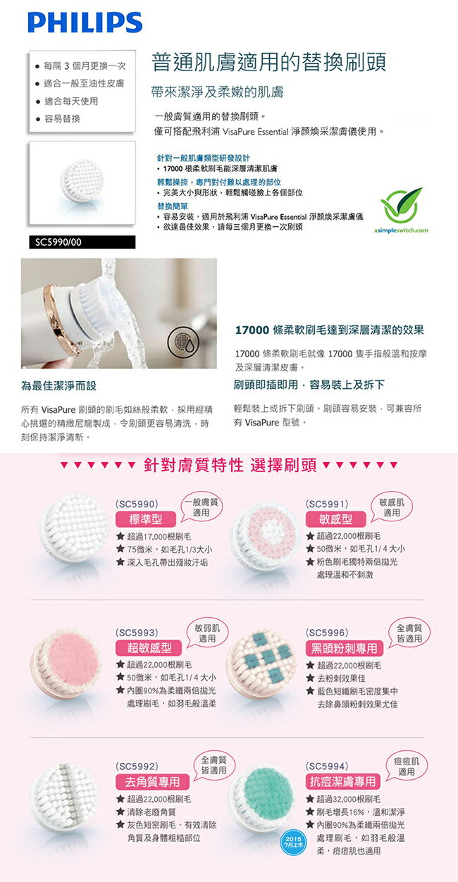 【買1送2】PHILIPS 飛利浦淨顏煥采潔膚儀一般膚質刷頭 SC5990 去角質刷頭 SC5992 適用SC5275及SC5265