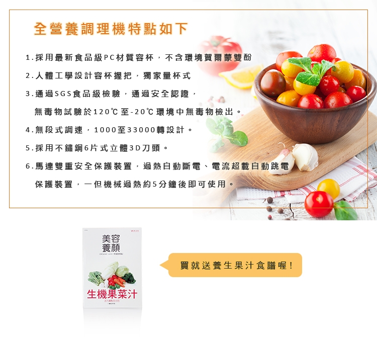 配件 說明/保證書、小杯蓋、杯帽、攪拌棒、養生生機食譜