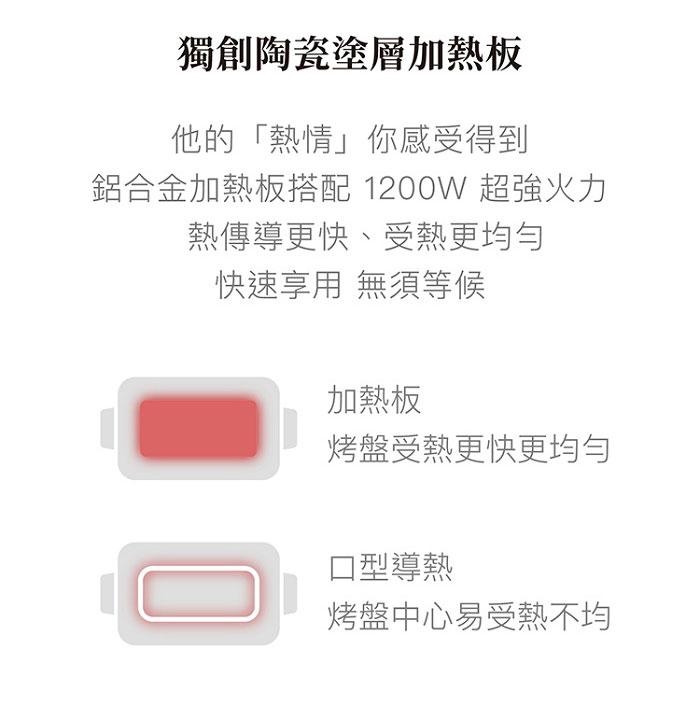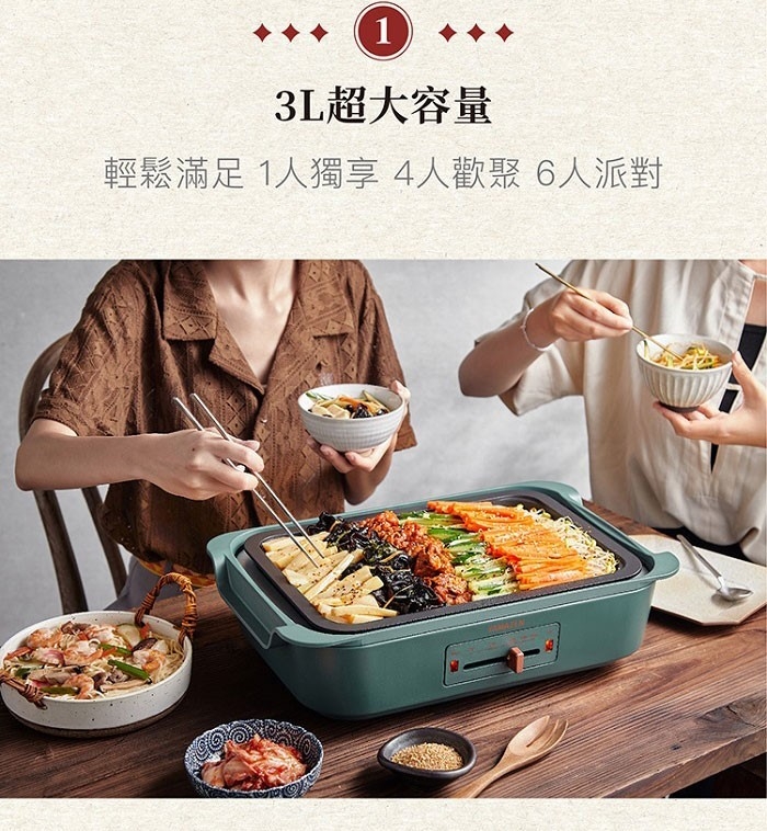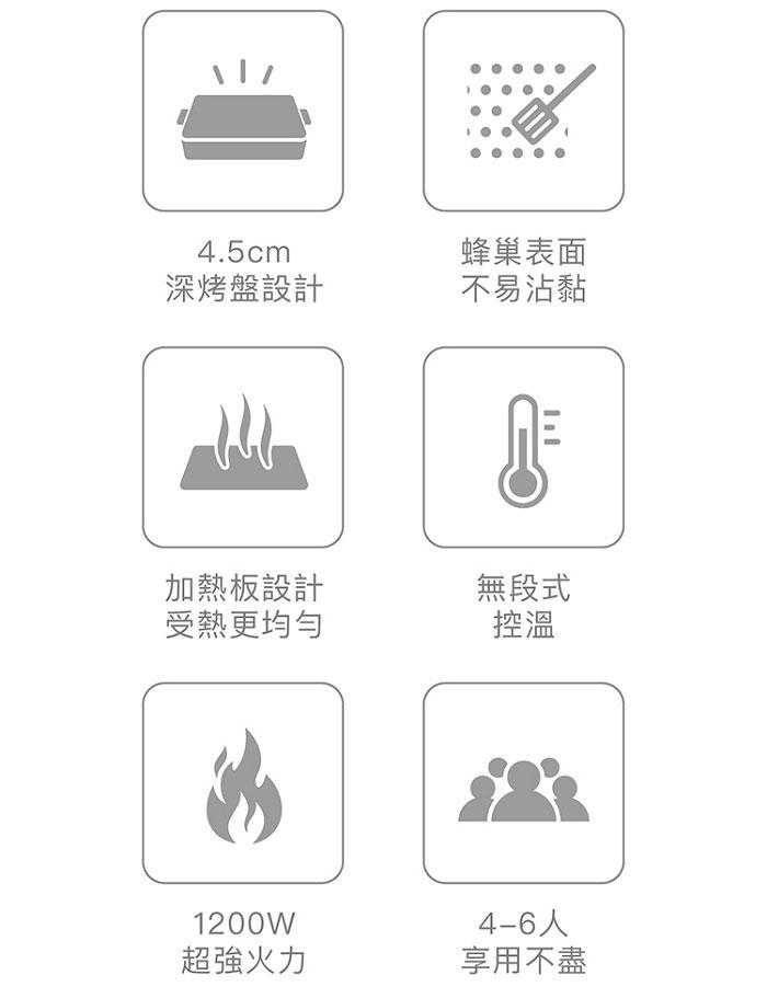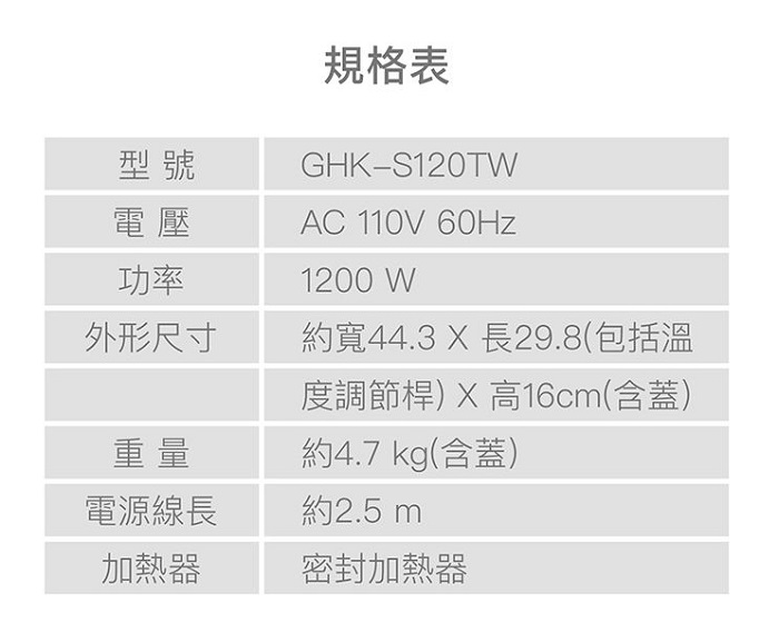 【商品特色】 🍳3L超大容量,適用4-6個人 🍳不沾塗層+特殊蜂巢狀凸起設計 🍳4.5cm深型烤盤,不易溢出 🍳獨家首創陶瓷塗層加熱板,受熱更快更均勻 🍳1200W超強火力 🍳80°-230°多段溫控設計 🍳一體成形加寬手把,移動安全更加順手 🍳2.5m超長電源線,使用不受限 【商品規格】 🛒型號:GHK-S120TW 🛒電壓:AC110V 60Hz 🛒功率:1200 W 🛒外形尺寸:約寬44.3X29.8 (包括溫度調節桿)X高16cm(含蓋) 🛒重量 :約4.7kg(含蓋) 🛒電源線長 :約2.5m 🛒加熱器 :密封加熱器 🛒產地:中國 🛒保固:一年
