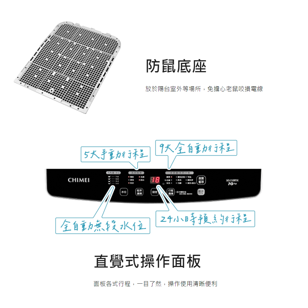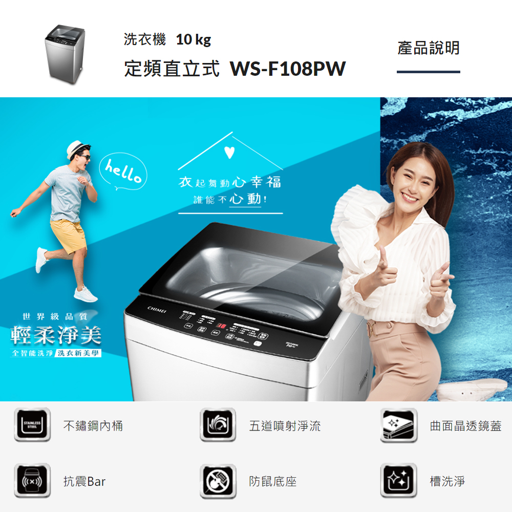 【CHIMEI奇美】 10公斤定頻直立式洗衣機 (WS-F108PW) 含基本安裝+舊機回收