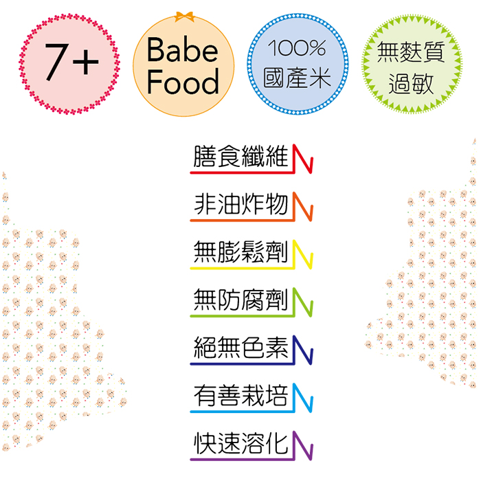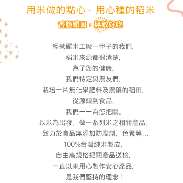 專為寶寶量身規劃的點心,穀物熟化技術,幫助寶寶消化好吸收,非油炸無添加無膨鬆劑,最單純的好滋味,寶寶副食品的最佳選擇。