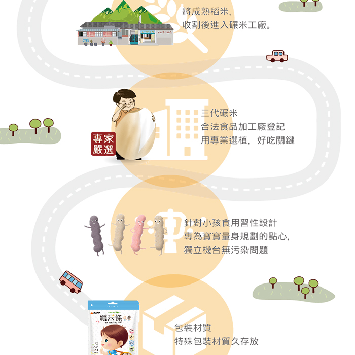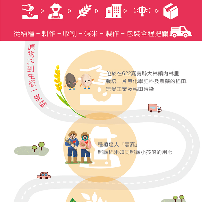 經營碾米工廠一甲子的我們,稻米來源都很清楚,為了您的寶寶,我們特定與農友們,栽培一片無化學肥料及農藥的稻田,從源頭到食品,我們一一為您把關。