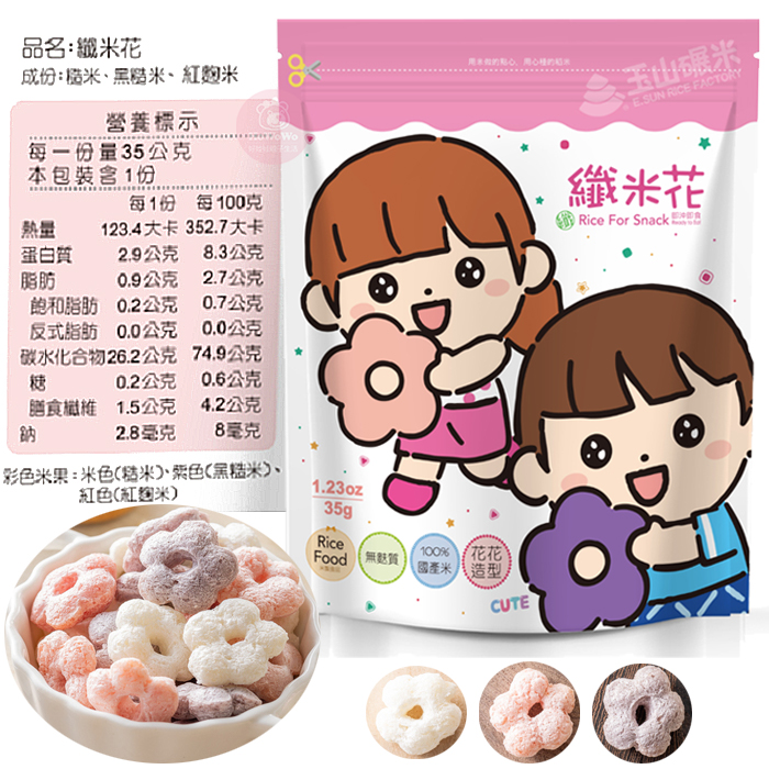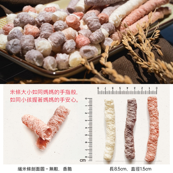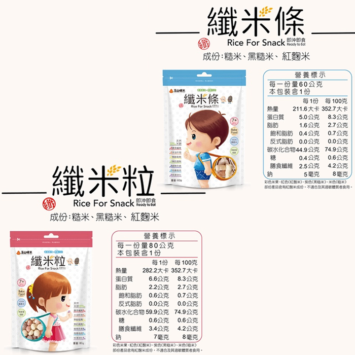 纖米粒80g、纖米條60g,成分:米色(糙米),紫色(黑米)、紅色(紅趜米),純米無添加