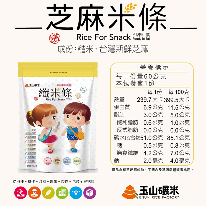 芝麻米條60g,成分:糙米、台灣黑芝麻粒