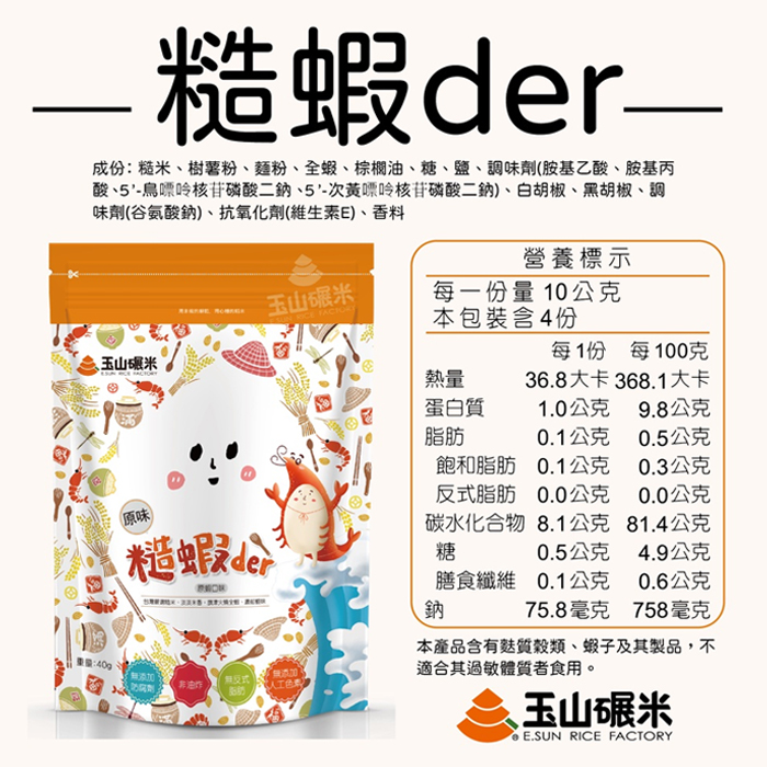 糙蝦米餅40g,成分:糙米、樹薯粉、麵粉、鮮全蝦、棕櫚油、糖、鹽、調味劑、白胡椒、黑胡椒、調味劑(谷氨酸鈉)、抗氧化劑(維生素E)、香料