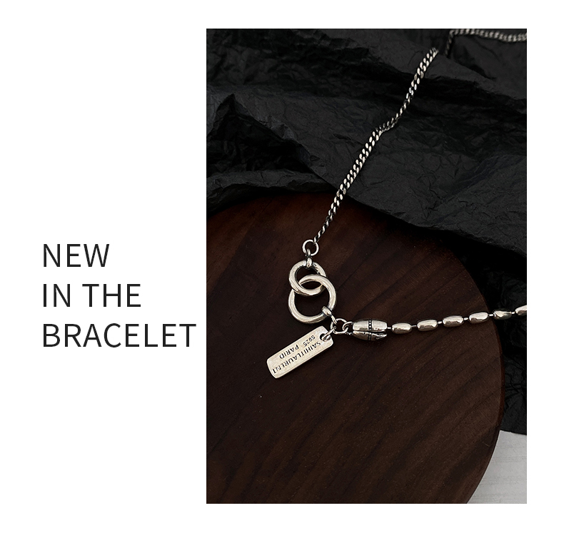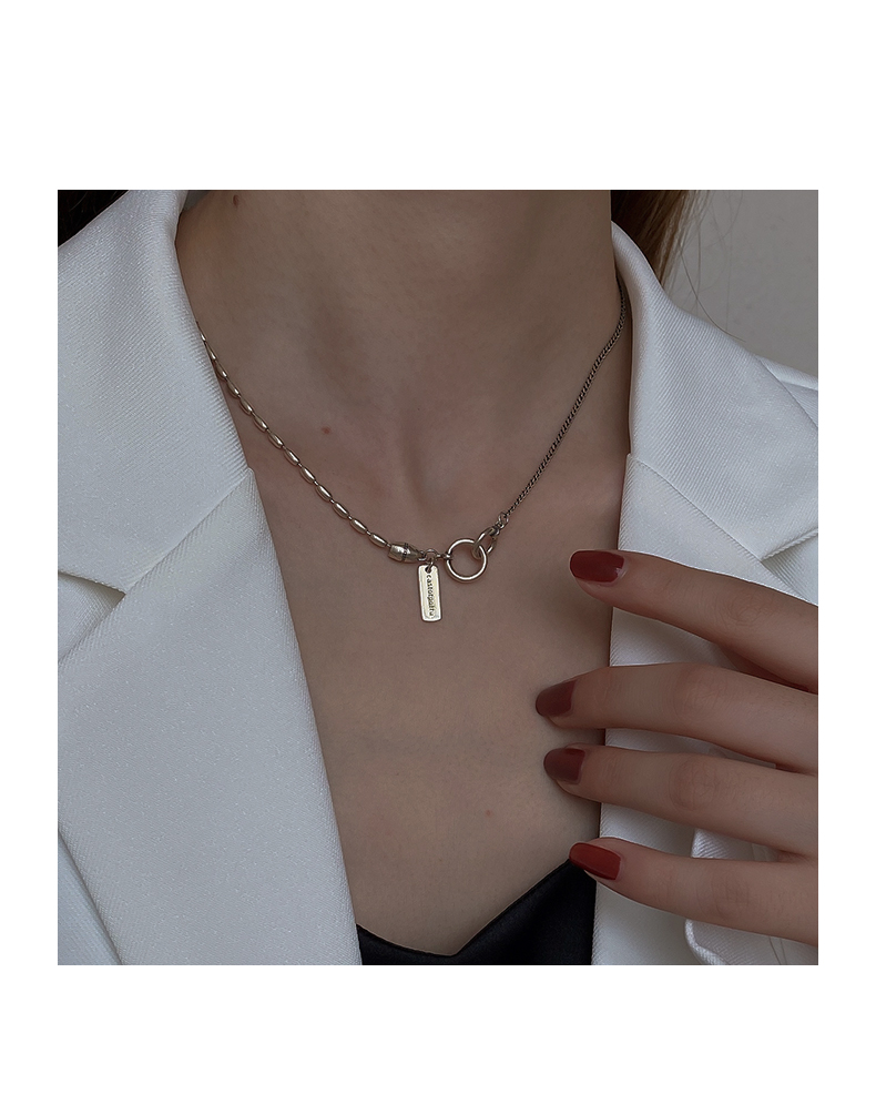 925純銀雙圓環項鏈女年新款方牌字母鎖骨鏈復古做舊嘻哈頸鏈