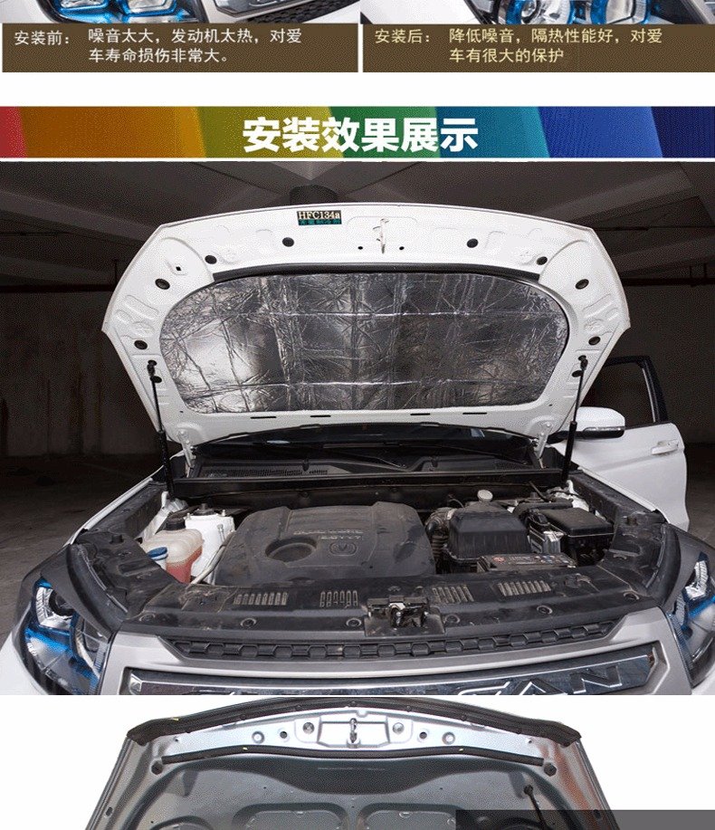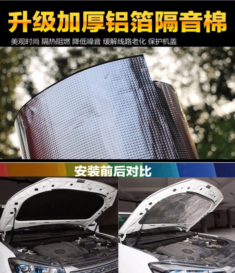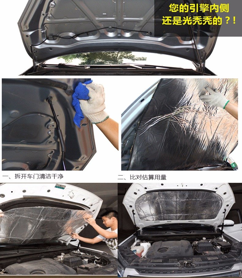 高溫產生的熱量直接傳至引擎蓋,引起引擎蓋的高溫過熱反映,久而久之機蓋的漆面發黃變色,嚴重的還會導致機蓋鐵皮脫落,引擎蓋隔音棉耐高溫,有效阻隔熱量外傳,保護引擎蓋。所有款式尺寸都是1x1.4米,因車型眾多,都要根據自己車型裁剪的哈 安裝方法: 安裝輕松簡便,直接粘上去,方便簡單不費勁,是愛車一族的。